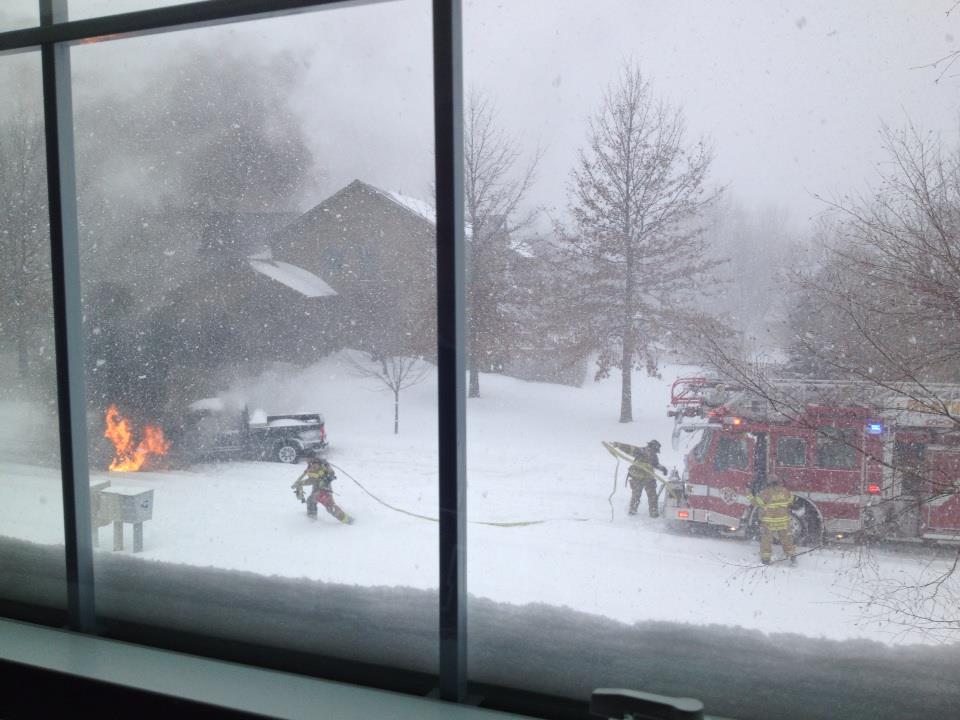 The neighbor across the street got stuck in the snow and started spinning his tires at full speed to get out. His truck caught fire and it took a good while for the fire department to make it because of the abnormally large amount of snow we received.