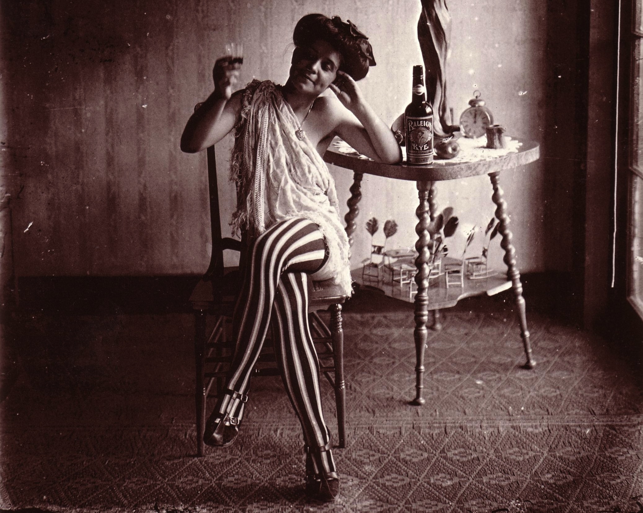 (Photo: “‘Storyville’ Red light district at the start of the 20th century. Seated woman wearing striped stockings, drinking ‘Raleigh’ Rye.” By E. J. Bellocq via Wikimedia)