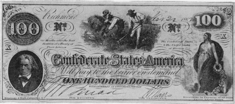 (Engraving: South Carolina politician John C. Calhoun pictured on a $100 bill issued by the Confederate States of America, 1862.)