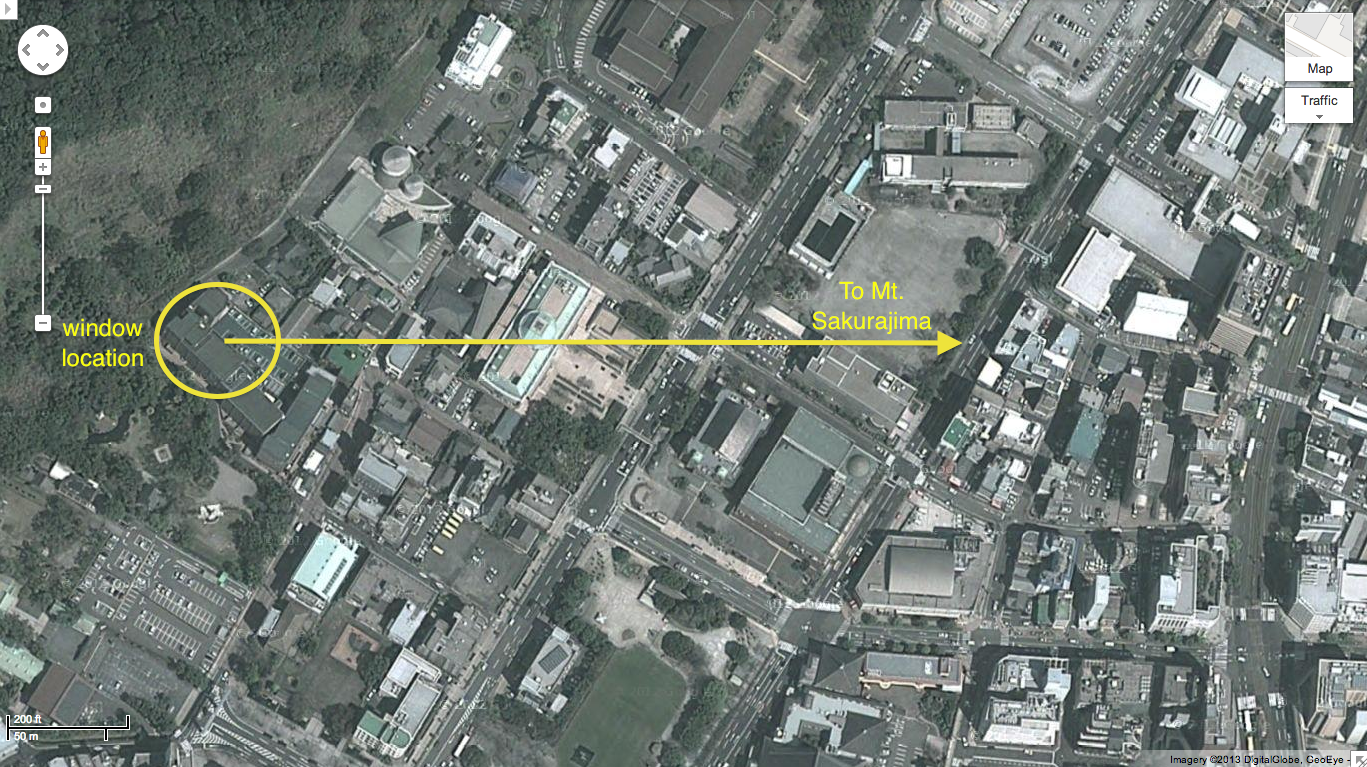 Kagoshima is the hometown of Heihachiro Togo, the great Japanese admiral who humiliated the Russian navy at Tsushima. Sakurajima sits due east of the city across a narrow stretch of Kagoshima Bay. Since the view is to the east, we are looking for a part of the city with streets running southwest-to-northeast. A quick aerial tour shows that the oldest part of the city – bombarded by the British in 1863 – fits the bill. The copper-roofed building is the Kagoshima City Museum of Art, and the green-surfaced parking deck in the VFYW’s foreground is plainly visible as part of a large apartment complex to the west. Its address is Shiroyamacho 3-35; Google translates the name of the building as “Surpass Shiroyama Park City.” I’ll say it’s a view from the top floor, about a quarter of the way along the northeast side of the third building up the hill.