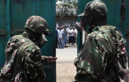 Kenyan paramilitary soldiers stand guard outside of a polling station as ballot-counting continues on March 6, 2013 in Mathare slum, in Nairobi. Kenyans awaited presidential results with growing frustration at controversial delays and mountains of spoiled ballots, five years after violence sparked by a disputed tallying process. AFP PHOTO/SIMON MAINA (Photo credit should read SIMON MAINA/AFP/Getty Images)