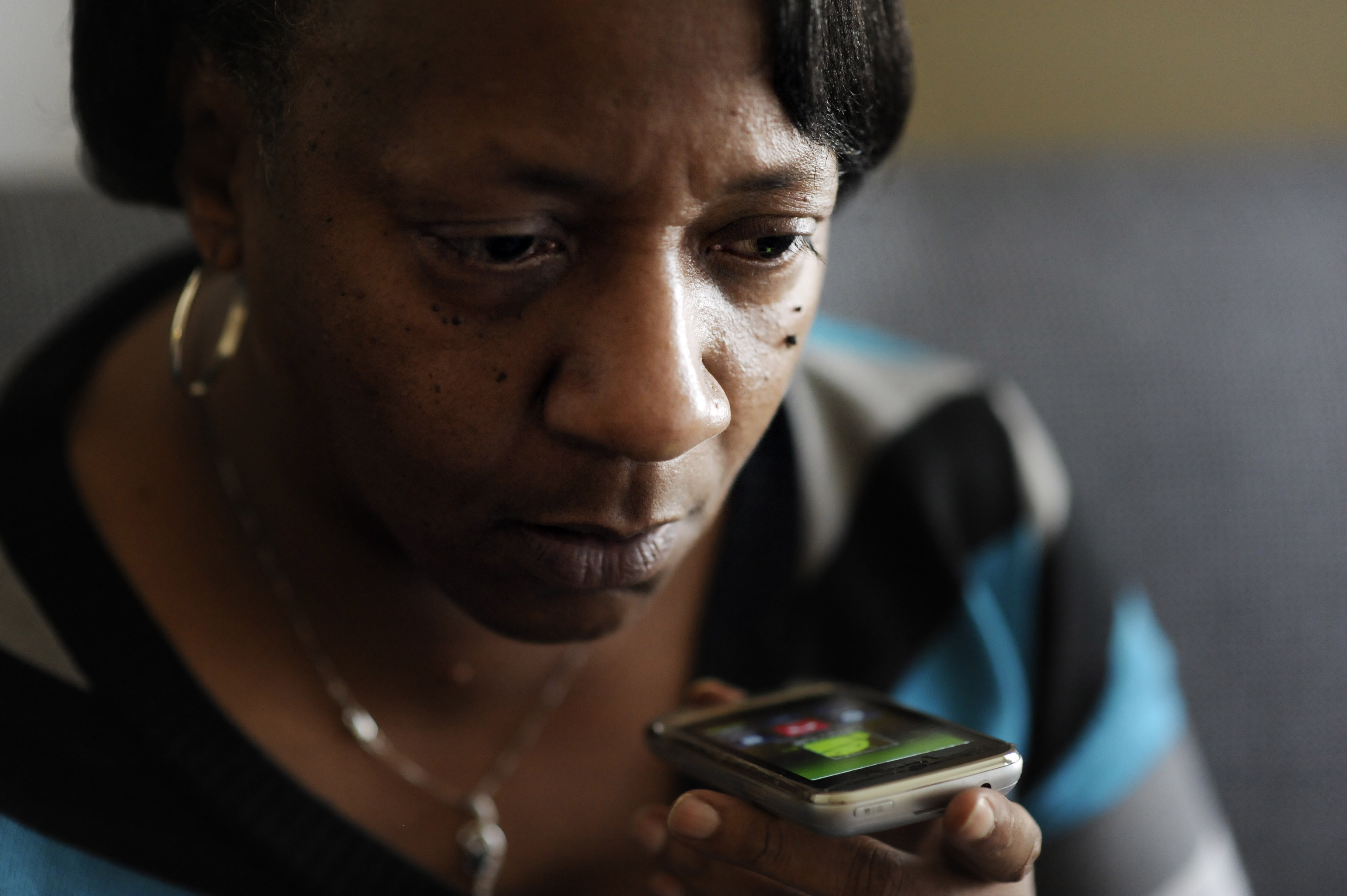 (Photo: After being homeless for years and calling the floors of Union Station home, Gail Faulkner now in her new apartment talks to a friend on her new IPhone at Erna’s House, the first permanent housing in Washington D.C. for homeless women, Wednesday, March 14, 2012. By Melina Mara/The Washington Post via Getty Images)