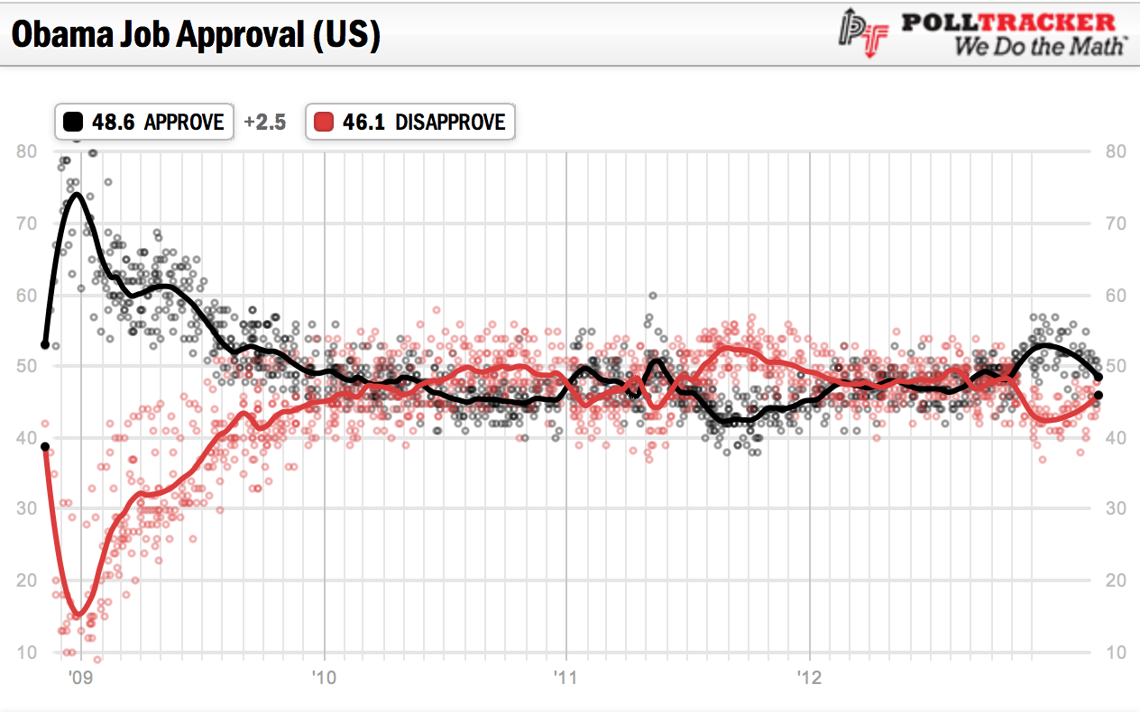 The ratings’ steady decline isn’t surprising. So long as Republicans remain uniformly dissatisfied with the president, Democrats need to be all but entirely unified for Obama’s approval ratings to eclipse 50 percent. Even support from 85 percent of Democrats, still an impressive show of party unity, wouldn’t be enough to keep the rating above 50. (YouGov/Economist and Washington Post polls both show Obama down to 87 percent approval among Democrats, while McClatchy/Marist showed Obama at 82 percent.) With tepid economic growth and a never-ending stream of manufactured crises to diminish the public’s faith in Washington, Obama wasn’t likely to maintain that kind of party unity. Even without those problems, it was only a matter of time before Obama’s ratings returned to the upper forties, which is more or less where he’s been for the last three years, with only the debt ceiling crisis causing his numbers to dip further. So it’s safe to assume that what we’re witnessing is merely a modest correction rather than the beginning of a severe drop in support.