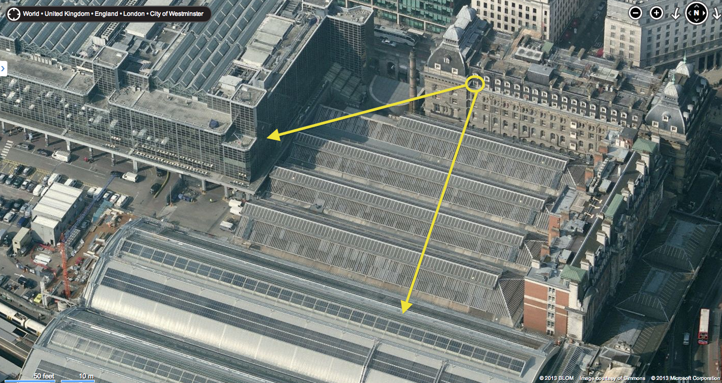 As a railways enthusiast and employee of Deutsche Bahn (German Rail), I was determined to solve this week’s VFYW upon seeing the unmistakable roof of a large train shed. Not immediately recognizing the surrounding buildings, I was able to quickly rule out Germany (I’m quite familiar with all of our train stations and their surroundings). Something about the modern architecture and the density said “London” to me, and being familiar with most of the city’s train stations I started my search there. St. Pancras was clearly out – its single-span train shed could not be mistaken for the two spans seen here. Neighboring King’s Cross was a possibility – it sports a two-span shed but a quick look at the adjacent buildings allowed me to rule it out as well. My next guess was Victoria, and lo and behold, the buildings matched!