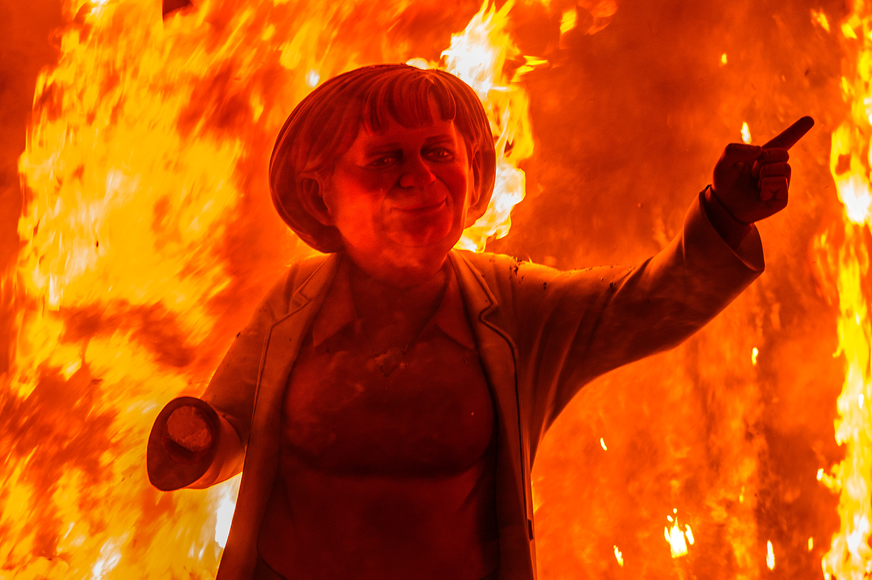 A ‘Ninot’ (puppet) depicting German Cancellor Angela Merkel burns during the last day of the Las Fallas Festival on March 20, 2013 in Valencia, Spain. The Fallas festival, which runs from March 15 until March 19, celebrates the arrival of spring with fireworks, fiestas and bonfires made by large puppets named Ninots. By David Ramos/Getty Images.