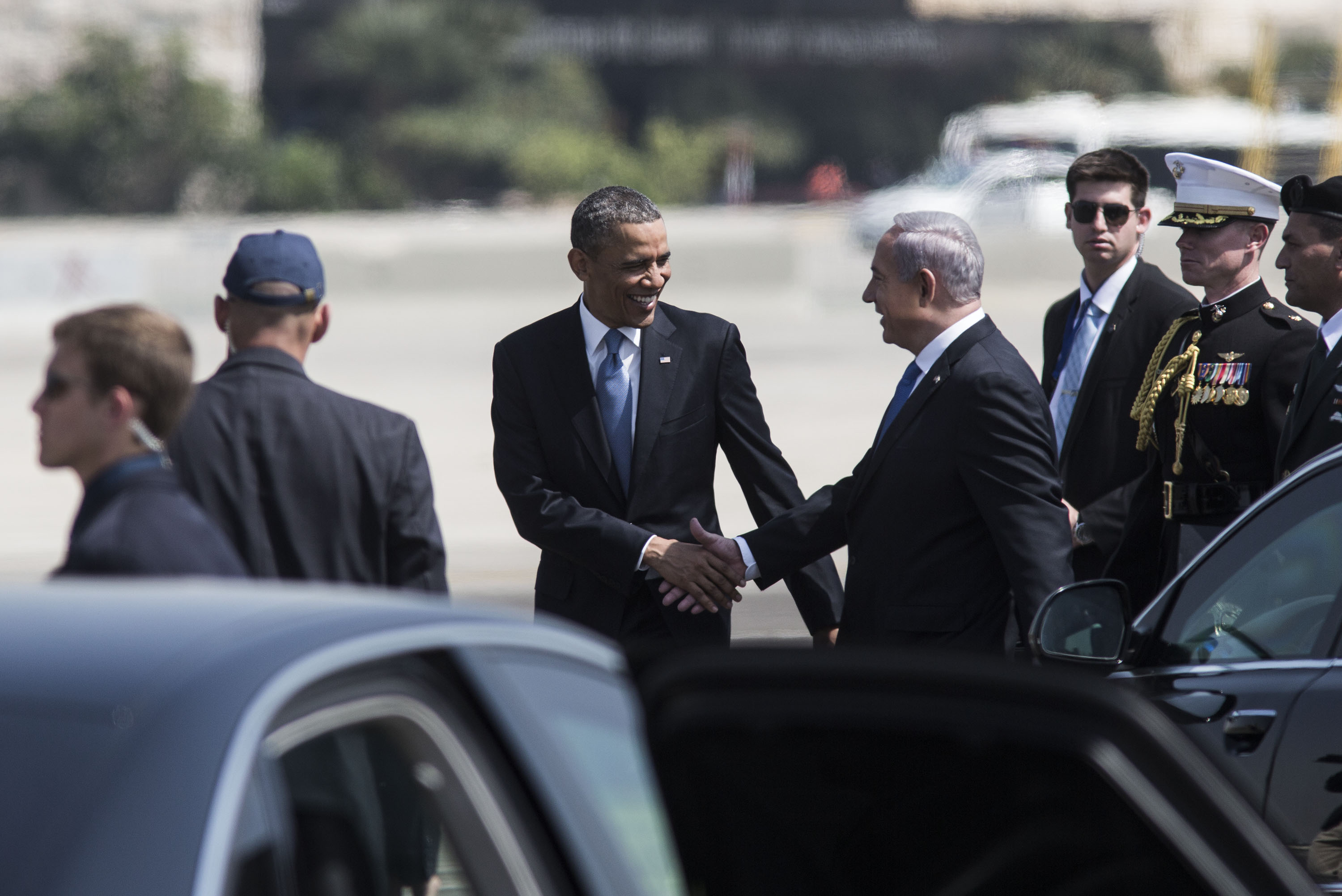 (Photo: US President Barack Obama shakes hands with Israeli Prime Minister Benjamin Netanyahu during an official welcoming ceremony on his arrival at Ben Gurion International Airport on March 20, 2013 near Tel Aviv, Israel. By Ilia Yefimovich/Getty Images)