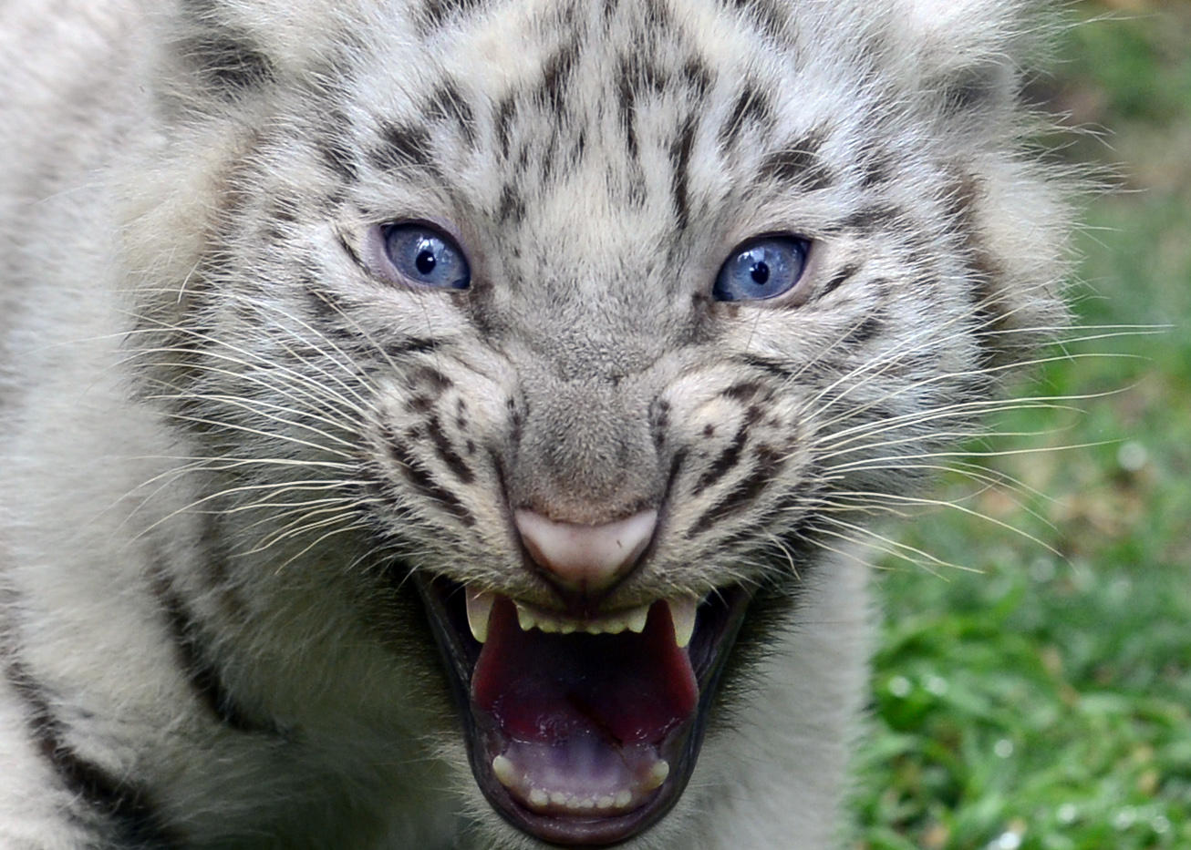 One of the four white Bengal tigers born in captivity on January 14, 2013 at the Buenos Aires zoo growls during their presentation on March 21, 2013. Their parents are white Bengal tigers Cleo and Rhiano, a young couple living at this zoo. By Daniel Garcia/AFP/Getty Images.