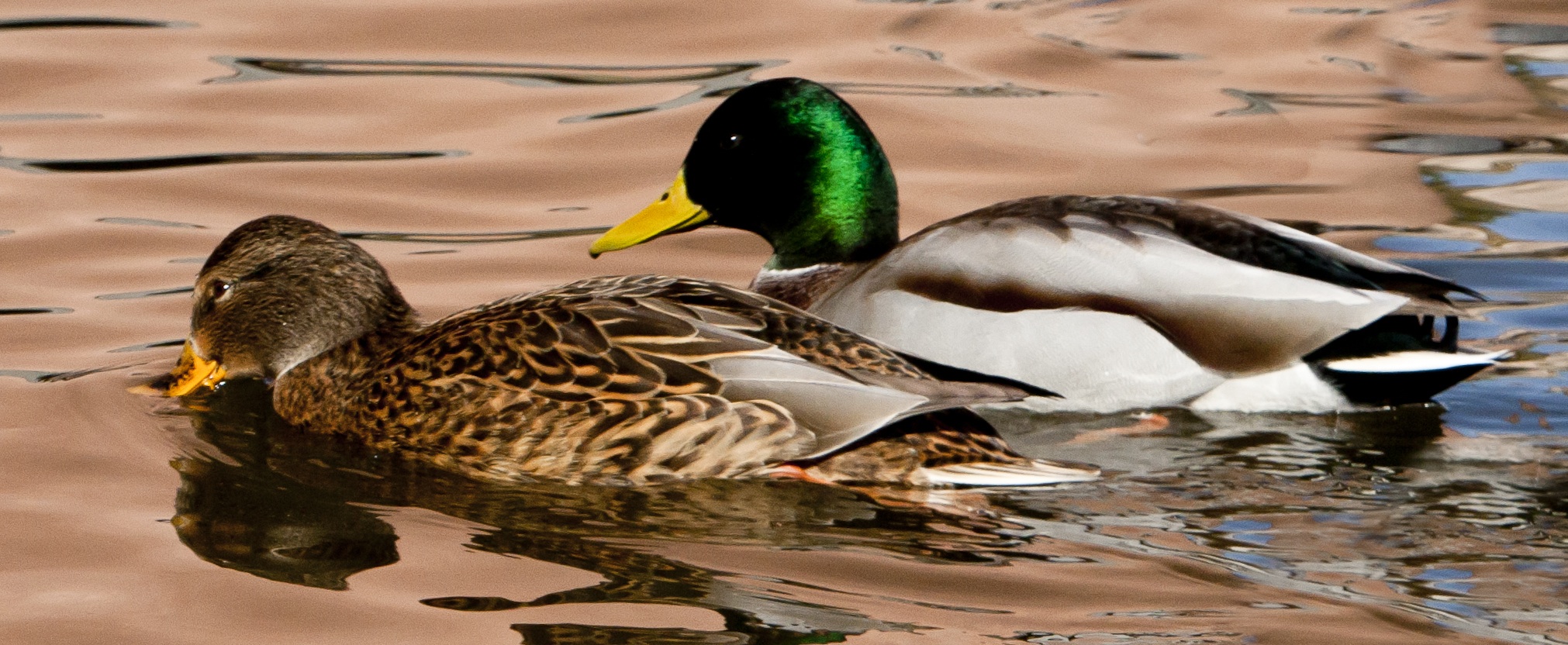 Plumage of plum, and grape, and pumpkin bills:Two mallards ride, are sunny baskets;