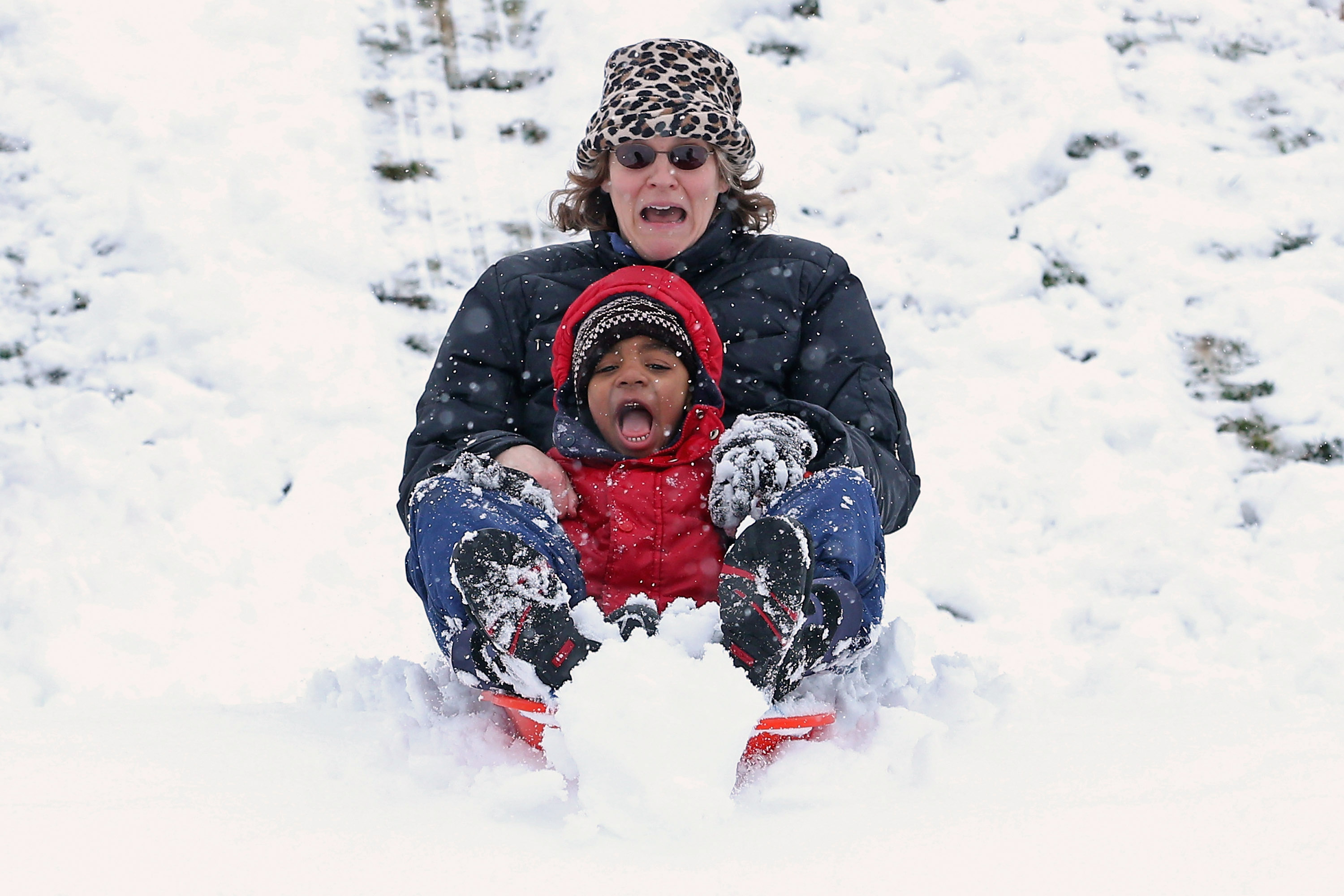 Cathy Eliot of Silver Spring, Maryland, and her son Matthew Haris, 3, sled down a hill at Takoma Park Middle School as a wet and heavy snow falls March 25, 2013. An early-spring snow blanketed parts of the nation’s capital less than a week before the Easter holiday. By Chip Somodevilla/Getty Images.