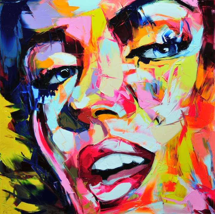 [Françoise Nielly]’s colorful portraits, created using thick strokes of oil on canvas, are based off simple black and white photographs. According to her bio, Nielly ‘takes a risk: her painting is sexual, her colors free, exuberant, surprising, even explosive, the cut of her knife incisive, her color pallete dazzling.’