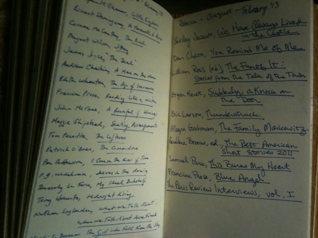 journaling. So we began writing down every book we read. (Jon gets the left page and I get the right. As you can tell, he’s a much faster reader.) It’s made me more determined to finish things, in the same way my childhood library’s summer reading program once did. It’s also the best diary I could have. If I want to remember December, 2003, I just need to see that I was reading Motherless Brooklyn and it all comes back: pneumonia, hospital, striped sweater, and the last time I ever played tennis.