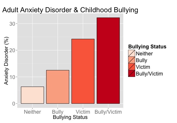 The first column represents the rate of anxiety disorders in the adults who were neither bullies nor victims in childhood. The second and third are those who were just bullies or just victims, and the last is the rate of disorder among adults who were both bullies and victims of bullying. Although anxiety is a universal experience, an anxiety disorder is a severe and potentially disabling condition. The rate of such disorders is almost four time as high among victims as among those with no experience of bullying, and nearly five times as high among those who were both bullies and victims.