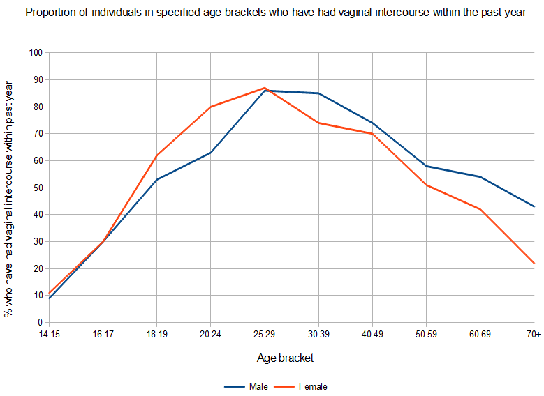Before the age of 25 it seems that women are more likely to have sex in a given year than an equivalent age man. After the age of 25 this starts to reverse, and men are more likely to be having sexual intercourse in a given year.