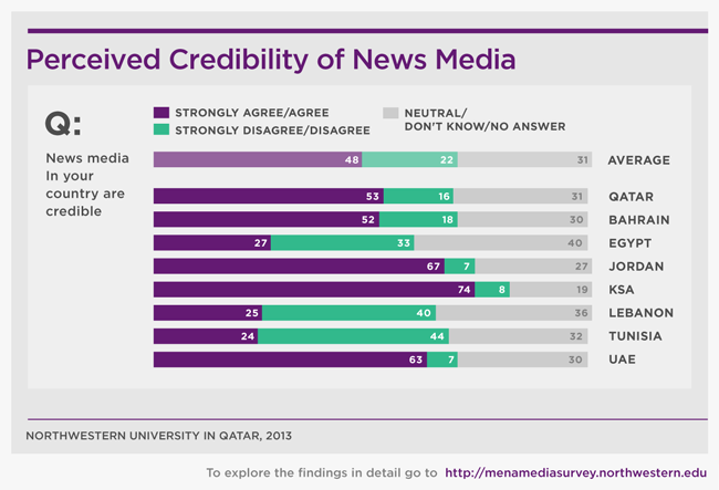 [A] large majority of adults in Saudi Arabia, Jordan and the United Arab Emirates believe their news media are credible (74 percent, 67 percent and 63 percent, respectively). Meanwhile, only approximately one in four of those surveyed in Egypt, Lebanon and Tunisia believe the news media in their countries are credible.