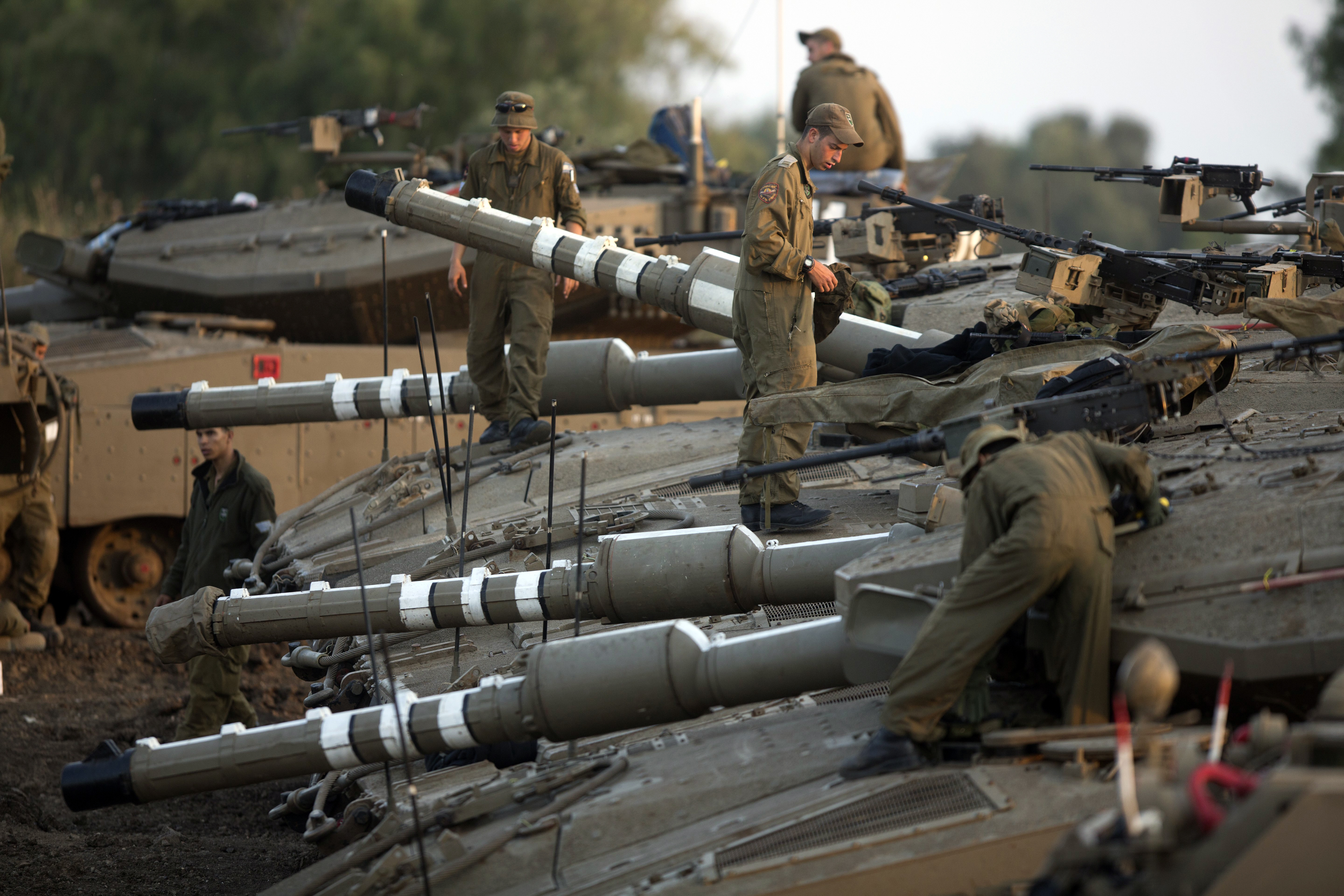 (Photo: Israeli soldiers walk on the top of their Merkava tanks deployed in the Israeli annexed Golan Heights near the border with Syria, on May 6, 2013. UN chief Ban Ki-moon has appealed for restraint after Israeli air strikes on targets near Damascus which prompted Syrian officials to warn ‘missiles are ready’ to retaliate. By Menahem Kahana/AFP/Getty Images)