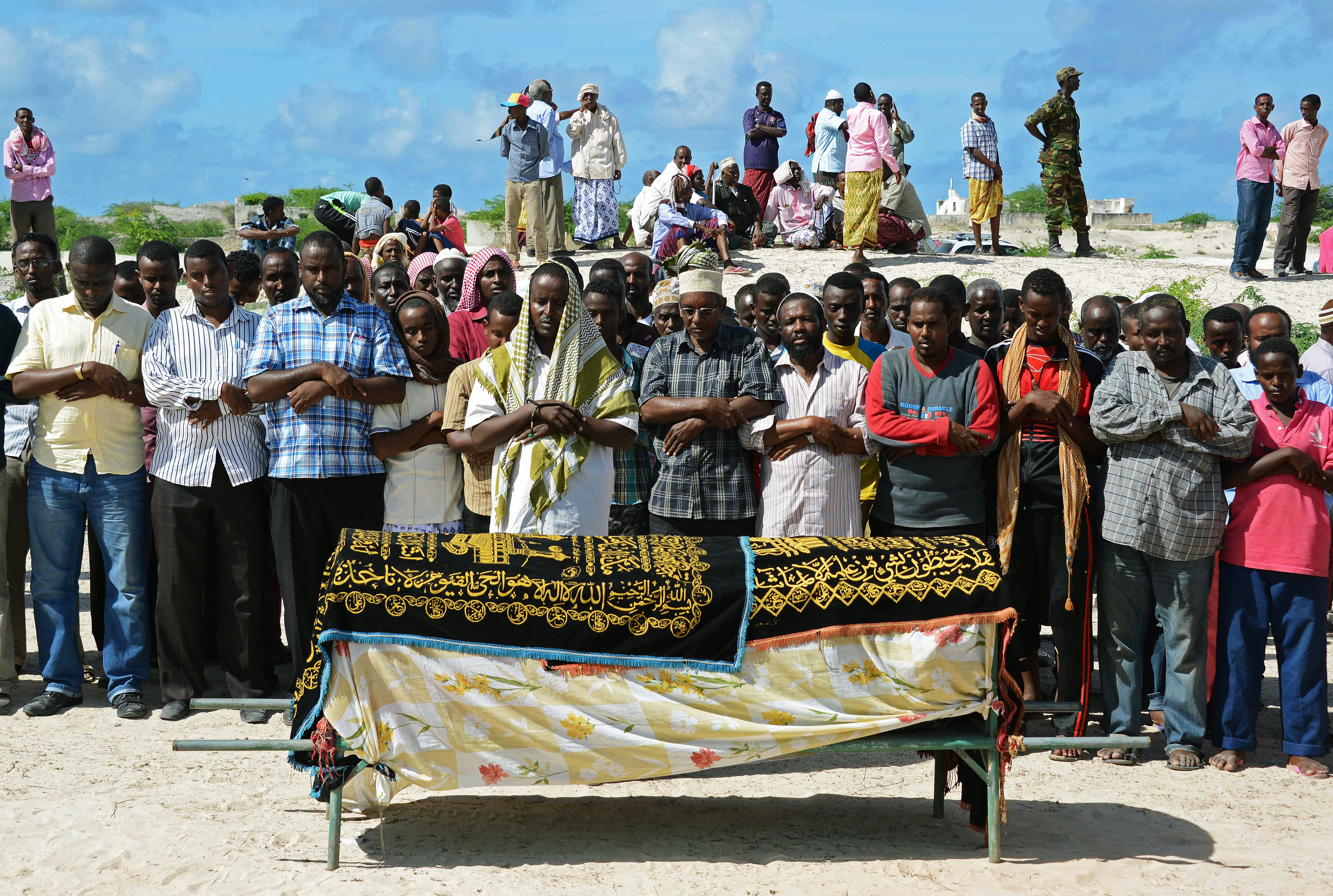 (Photo: Mourners pray beside the coffin of Somali journalist Mohamed Ibrahim Rageh in Jazira on the outskirts of Mogadishu on April 22, 2013. Rageh worked for Somali National Television and Radio Mogadishu and was shot dead by unknown gunmen as he reuturned home. Rageh is the fourth reporter to be murdered in Mogadishu this year. Somalia is one of the most dangerous places for journalists to work, with at least 18 media workers killed in 2012. By Mohamed Abdiwahab/AFP/Getty Images)
