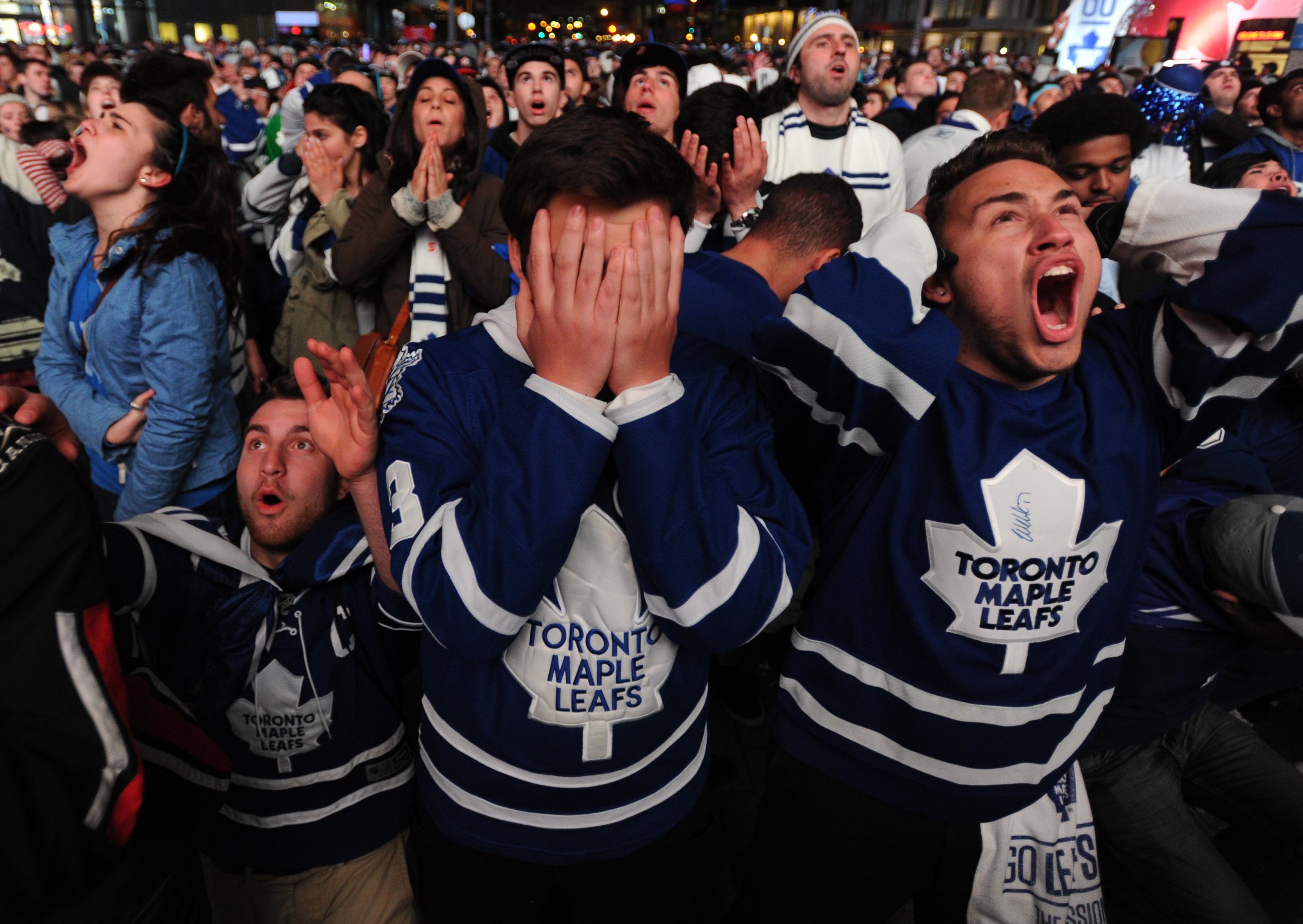 Toronto Maple Leaf fans show their emotions after the Boston Bruins scored late in the third period, tying the final do-or-die Game 7 at Maple Leaf Square. The Bruins went on to win 5-4. By Vince Talotta/Toronto Star via Getty Images.