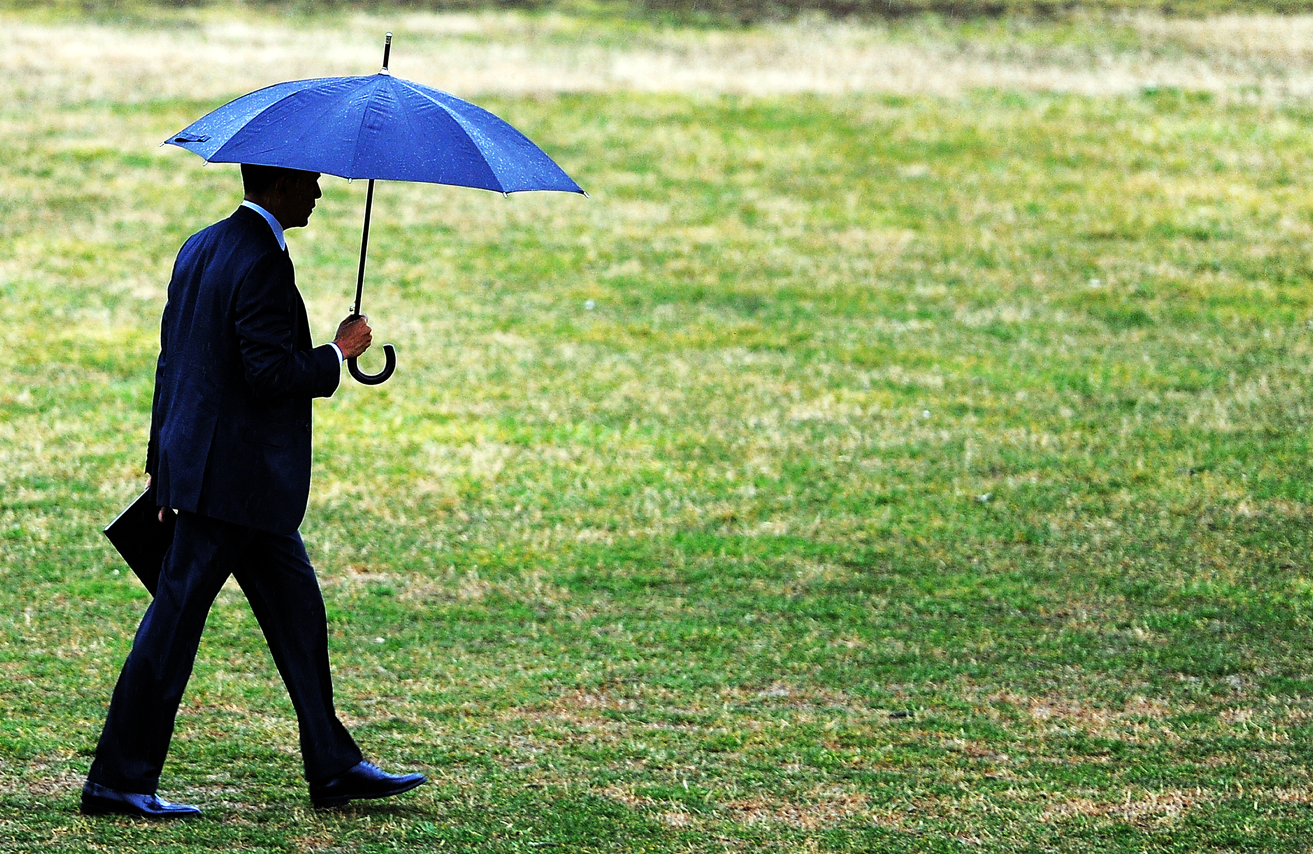 (Photo: US President Barack Obama uses an umbrella as he walks under rain to board Marine One after visiting wounded service members at the Walter Reed National Military Medical Center in Bethesda, Maryland, on March 2, 2012. By Jewel Samad/Getty.)