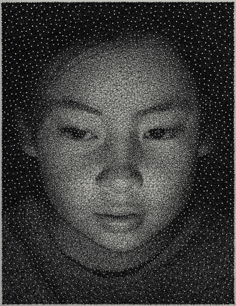 Kumi Yamashita‘s “Constellation – Mana no.2″ is comprised of only three elements: a wooden panel painted white, more than 7,000 tiny galvanized nails and a single, unbroken black sewing thread. Rodrigo at designboom observes, “The highly intricate multidimensional textures of the compositions bring out a realistic and almost organic quality to the faces.” A close-up of Yamashita’s piece after the jump: