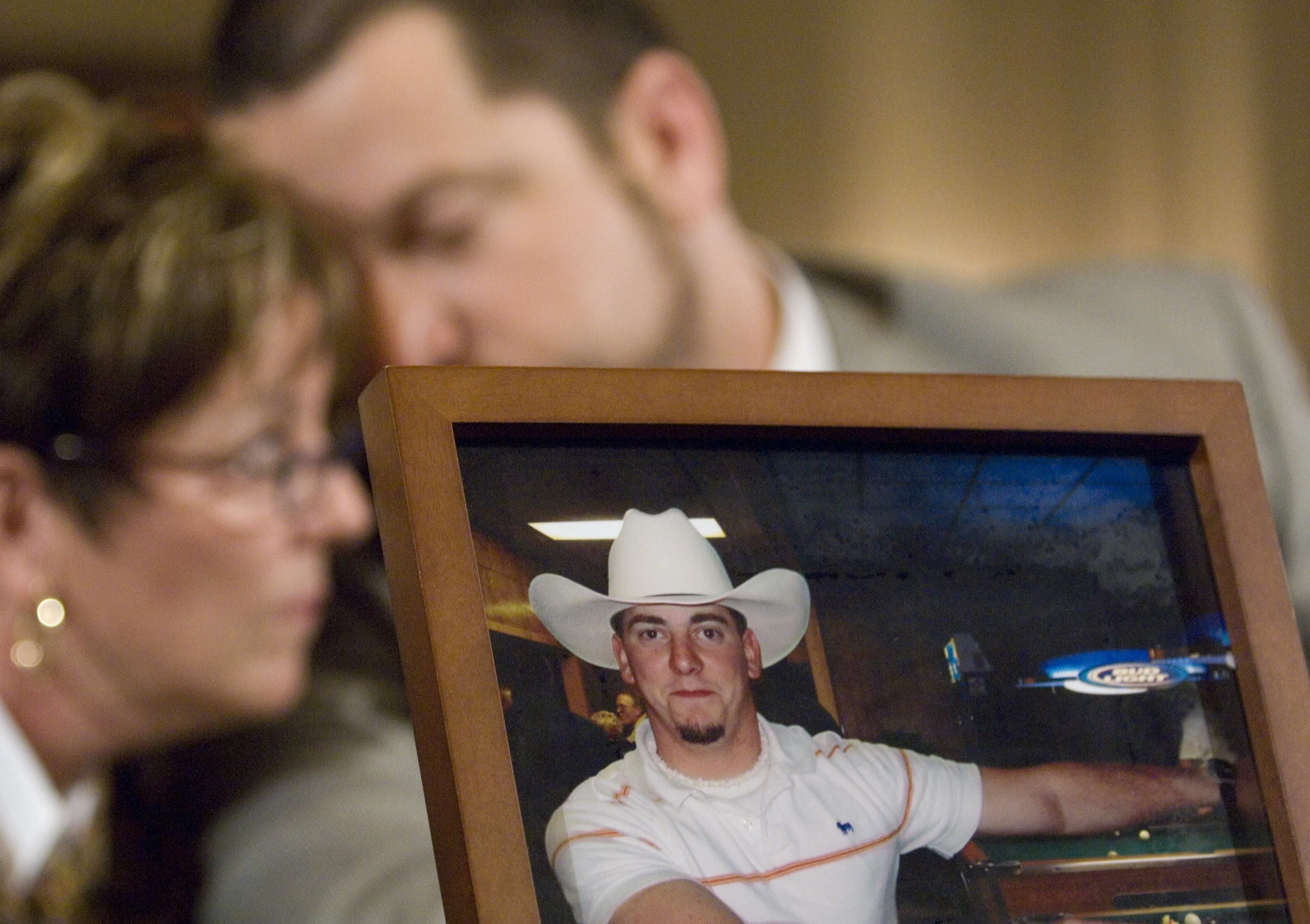 (Photo: Mike and Kim Bowman, of Forreston, Illinois, whisper behind a photo of their son, Specialist Tim Bowman, U.S. Army, Illinois National Guard, Bravo Troop, 106th Calvary, as they prepare to testify during the House Veterans Affairs Committee hearing on ‘Stopping Suicides: Mental Health Challenges Within the Department of Veterans Affairs (VA),’ on Wednesday, Dec. 12, 2007. Their son shot himself after returning form duty in Iraq. By Bill Clark/Roll Call/Getty Images)