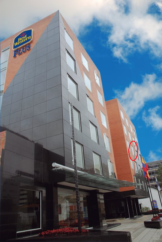 Bogota, but not much success until I identified the large black building in the far background, which shows up in several of the photos taken from the ridge to the east of the city. From there it was a matter of wandering off in the right direction until the right collection of roofs showed up. Not the usual hotel/motel, at least Google doesn’t admit to it. I’m guessing just from sight lines that this was taken from the sixth floor, north-east corner of the building (see attached photo). BTW I tried googling pizzarias to see if I could narrow it down that way and had zero luck.