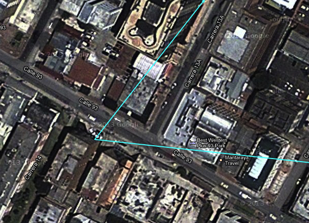 It’s Bogota, Colombia, probably a Sunday by looks of no traffic, near Parque 93; from the Google maps, Calle 93 w/Carrera 13A. the nice northern neighborhoods, Chico, looking east north east to the hills. You can see the trace of the road to La Calera going up the forested hill on the right. I’m a loyal, currently freeloading, reader. Dag, for karma I’ll [tinypass_offer text=”subscribe”], now that I’m on the proverbial map.