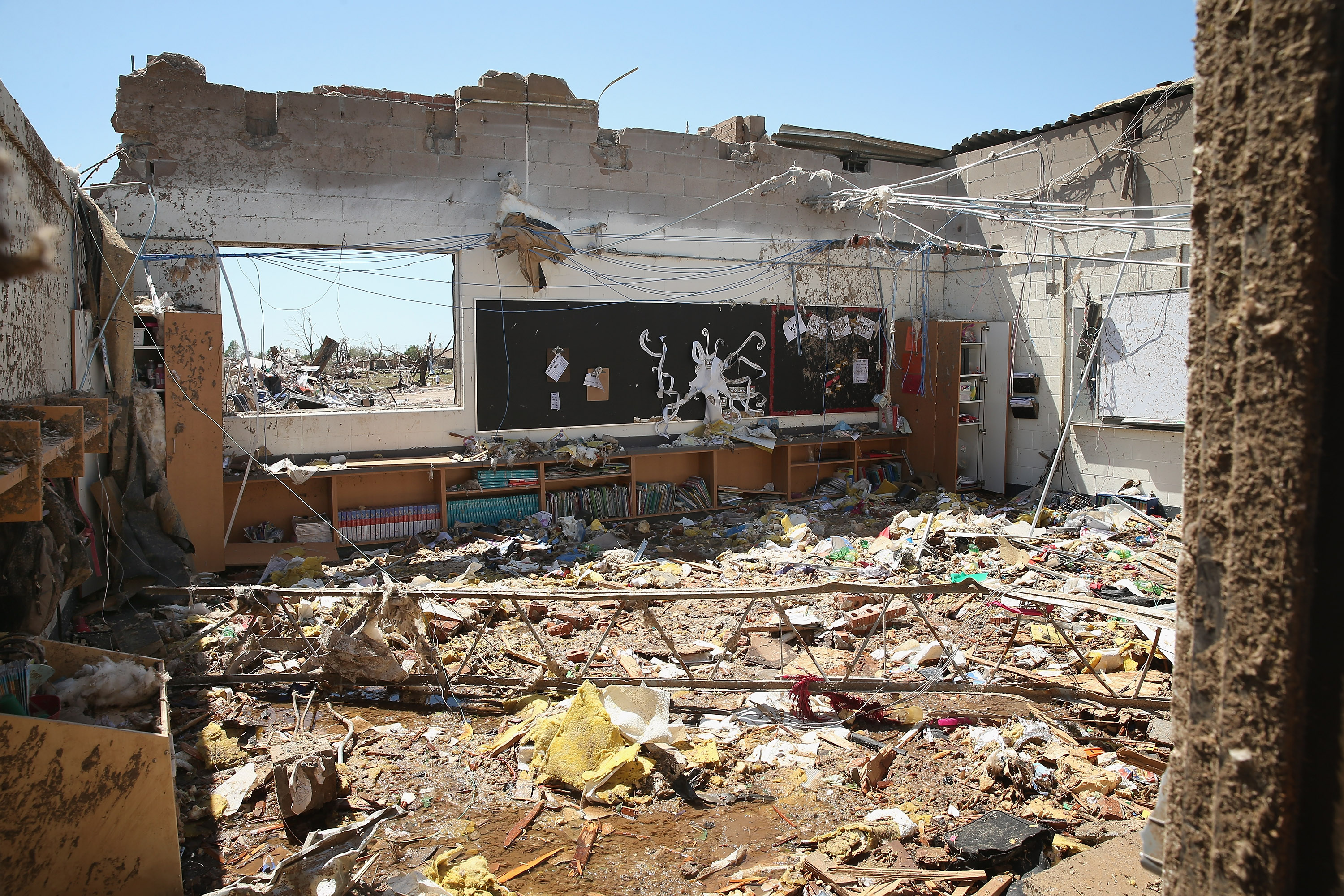 (Photo: Debris litters what remains of a classroom at Plaza Towers Elementary School after it was destroyed by a tornado that ripped through the area on May 22, 2013 in Moore, Oklahoma. Seven children died in the school during the tornado. The tornado of at least EF4 strength and two miles wide touched down May 20 killing at least 24 people and leaving behind extensive damage to homes and businesses. U.S. President Barack Obama promised federal aid to supplement state and local recovery efforts. By Scott Olson/Getty Images)