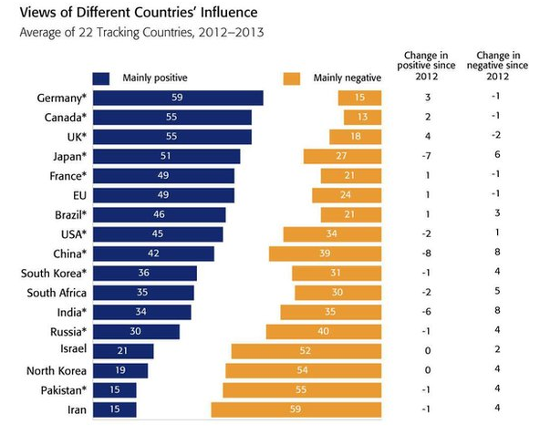 It’s the result of the latest annual Country Ratings Poll for the BBC World Service. Britain has been buoyed by the Olympics; China and India have sunk; Germany has also seen gains in approval, even in France! And then you notice the group of countries Greater Israel is now lumped in with: North Korea, Iran and Pakistan. Good going, Netanyahu! Just keep building those settlements.