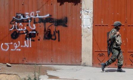 A Lebanese army soldier walks past graffiti on a closed shop which reads: “You shall fall Bashar..” in Tripoli’s Sunni neighbourhood of Bab al-Tabbaneh, whose residents support the rebels battling to topple the regime in nearby Syria, during a truce with the Alawite district of Jabal Mohsen on May 27, 2013. Firefights in northern Lebanon between Sunni Muslims and Alawites — the Shiite offshoot sect to which Syrian President Bashar al-Assad belongs — killed 30 people last week, according to security sources. AFP PHOTO/JOSEPH EID (Photo credit should read JOSEPH EID/AFP/Getty Images)