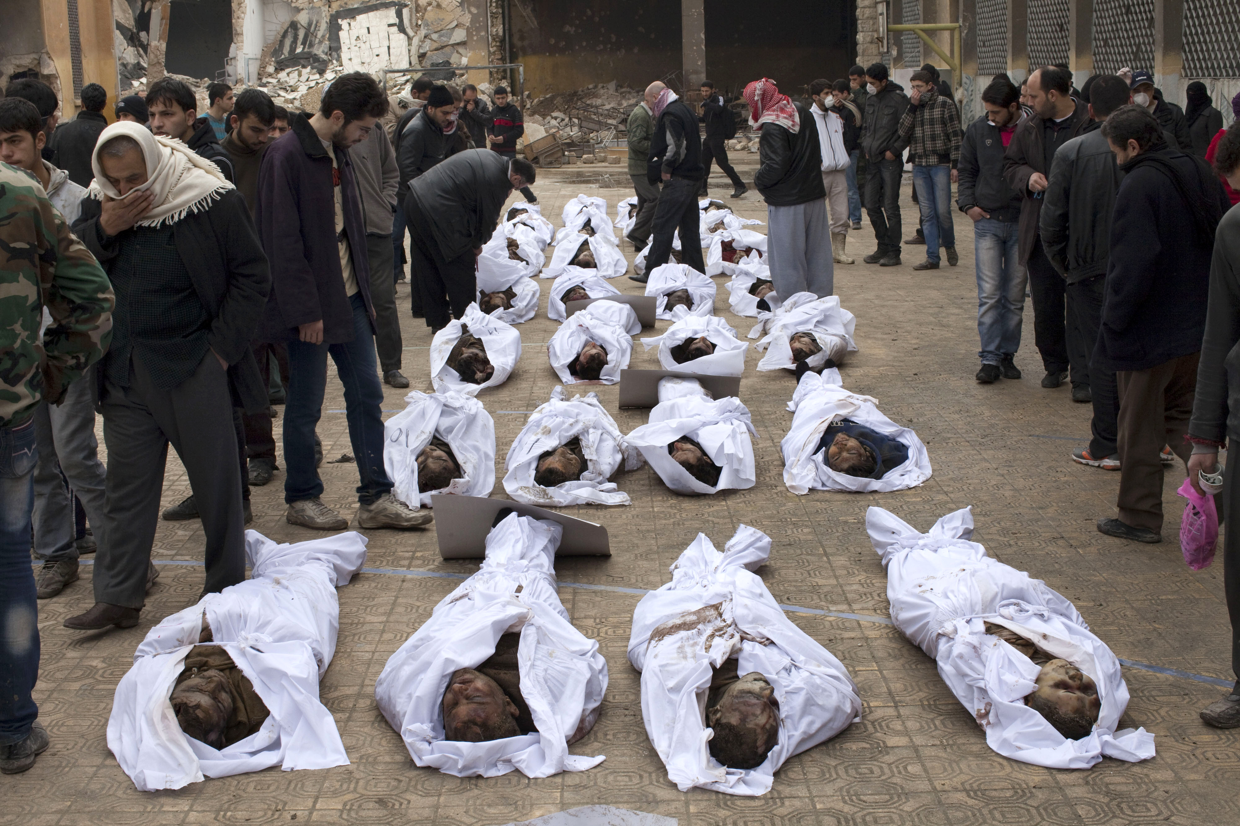 (Photo: Men search for their relatives amongst the bodies of Syrian civilians executed and dumped in the Quweiq river, in the grounds of the courtyard of the Yarmouk School, in the Bustan al-Qasr district of Aleppo on January 30, 2013. By J M Lopez/AFP/Getty Images)