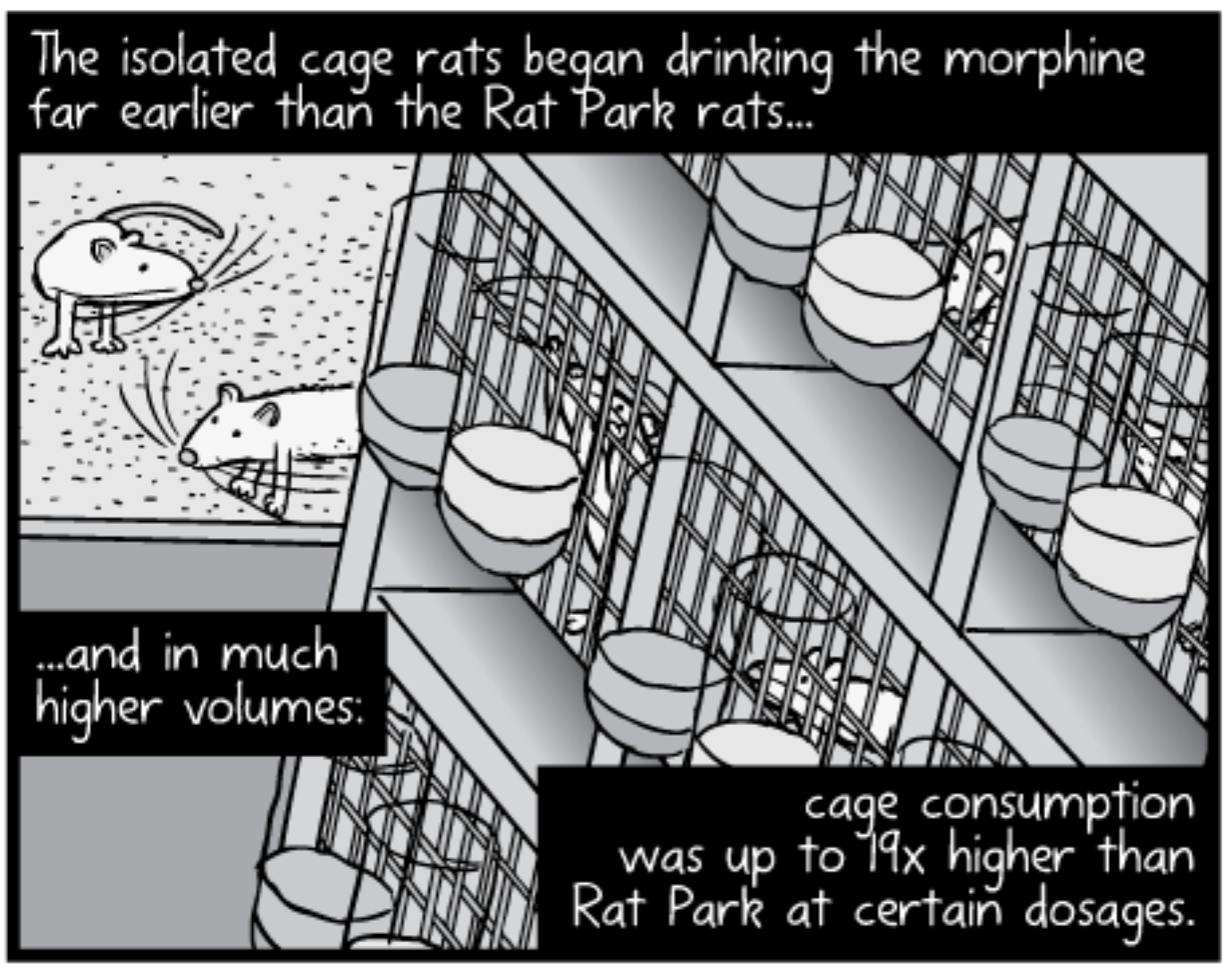 Stuart McMillen has a fascinating new comic on the question. He focuses on the Rat Park research of Bruce Alexander, who compared the drug habits of isolated rats and properly socialized rats. One frame: