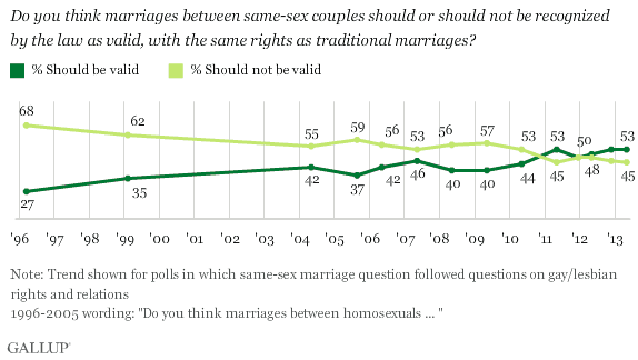 I find this evidence for not wanting the Supreme Court to pre-empt this long democratic deliberation. Yes, ensure that the federal government returns to its traditional role as deferrer to states when it comes to what a civil marriage license is. But then be patient. Better to win by hearts and minds, as we are, than to cut off that process and give opponents a genuine reason to cry foul.