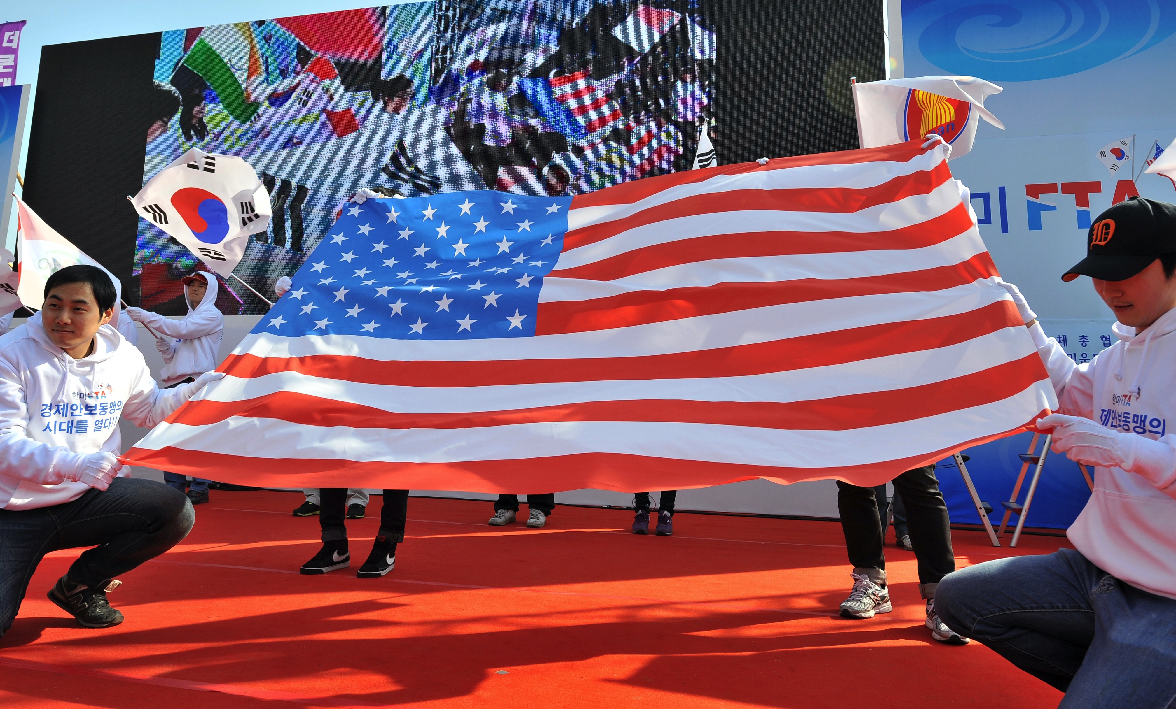 (Photo: South Korean conservative activists display a US flag during a rally to support South Korea-US free trade agreement in Seoul on March 15, 2012. A long-delayed free trade agreement between the United States and South Korea took effect amid praises from their leaders but also sparking scattered protests. By Jung Yeon-Je/AFP/Getty Images)