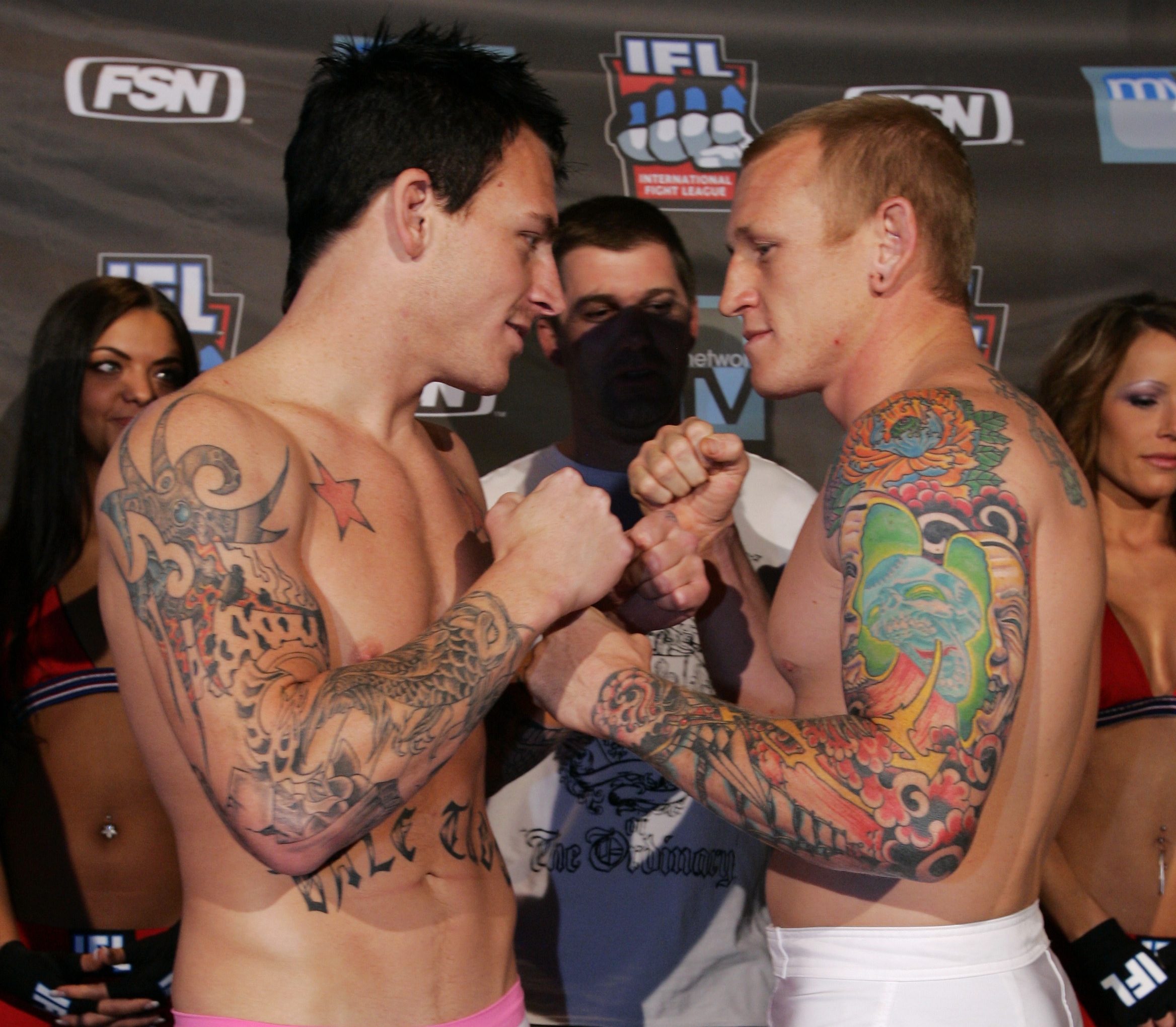 (Photo: Justin Levens of the Southern California Condors (L) and Brian Foster of the San Jose Razorclaws (R) face off during the International Fight League weigh-in for the fights between the Condors versus the Razorclaws and the Red Bears versus Silverbacks at Buffalo Wild Wings on May 18, 2007 in Hoffman Estates, Illinois. By Brian Bahr/Getty Images for IFL)