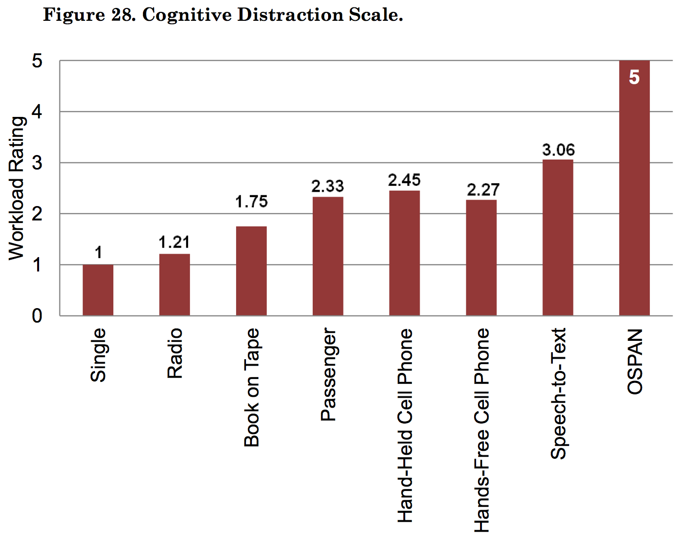 Driving alone and without devices was given a baseline workload level of 1. You can see that adding in the radio or book on tape increases mental workload, while talking on a cell phone is about the same as talking to a passenger, while speak-to-text programs were even higher. (OSPAN is a specific cognition test you can read about here.)