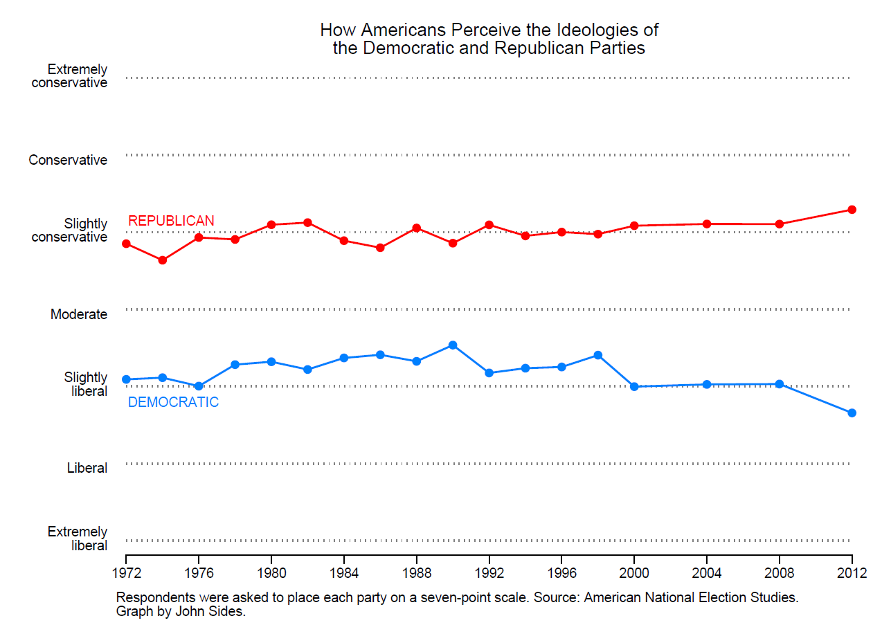 Two features of this graph deserve emphasis, I think. One is how poorly the trends conform to prevailing narratives about how the parties have changed. In particular, there is precious little evidence that Americans perceived the Democratic Party’s “re-boot” in the late 1980s and 1990s—when many observers believe that the party moved to the center under the influence of the Democratic Leadership Council and Bill Clinton. This is one reason why I’m skeptical that ideological “re-branding” is all that consequential.
