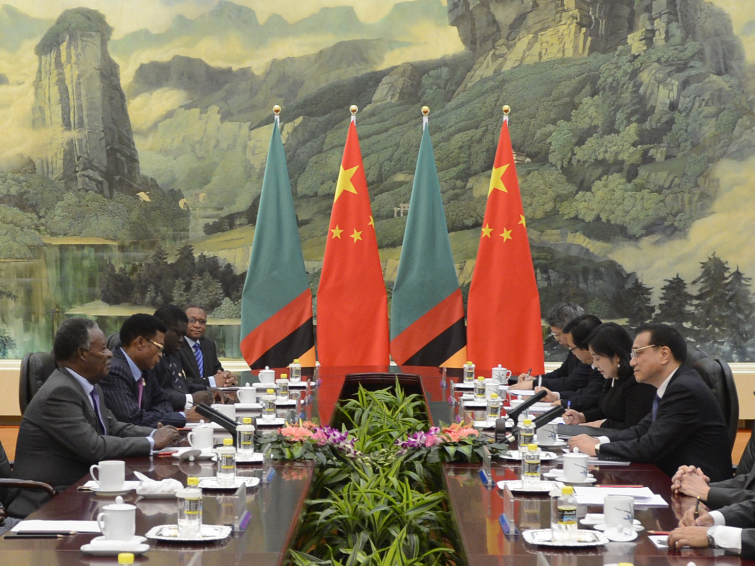 (Photo: Chinese Premier Li Keqiang speaks with Zambia’s President Michael Sata during a meeting at the Great Hall of the People in Beijing, China on April 10, 2013. By Yoshsuke Mizuno – Pool/Getty Images)