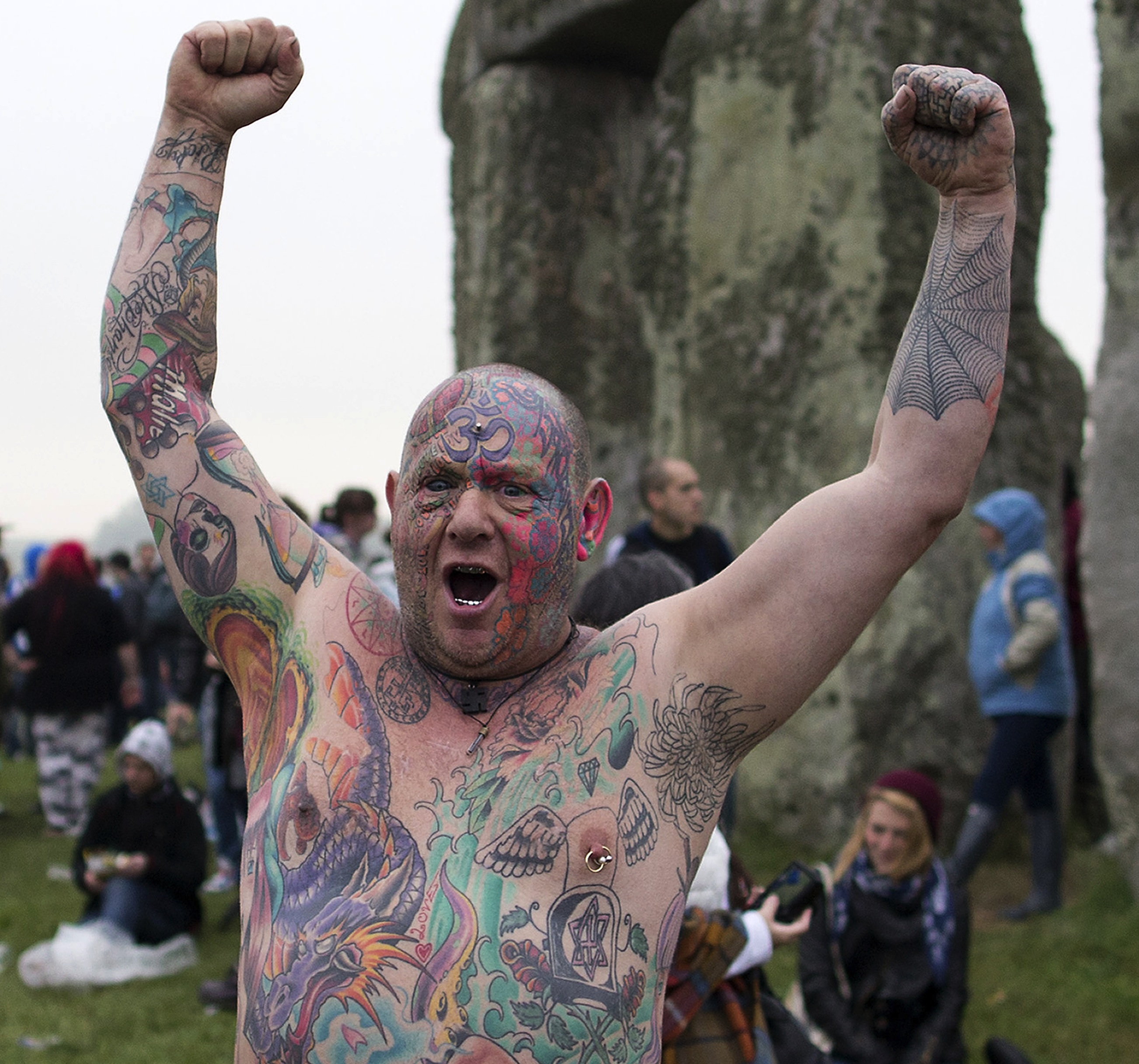 Revelers celebrate the pagan festival of ‘Summer Solstice’ at Stonehenge in Wiltshire in southern England, on June 21, 2013. The festival, which dates back thousands of years, celebrates the longest day of the year when the sun is at its maximum elevation. Modern druids and people gather at the landmark Stonehenge every year to see the sun rise on the first morning of summer. By Justin Tallis/AFP/Getty Images.