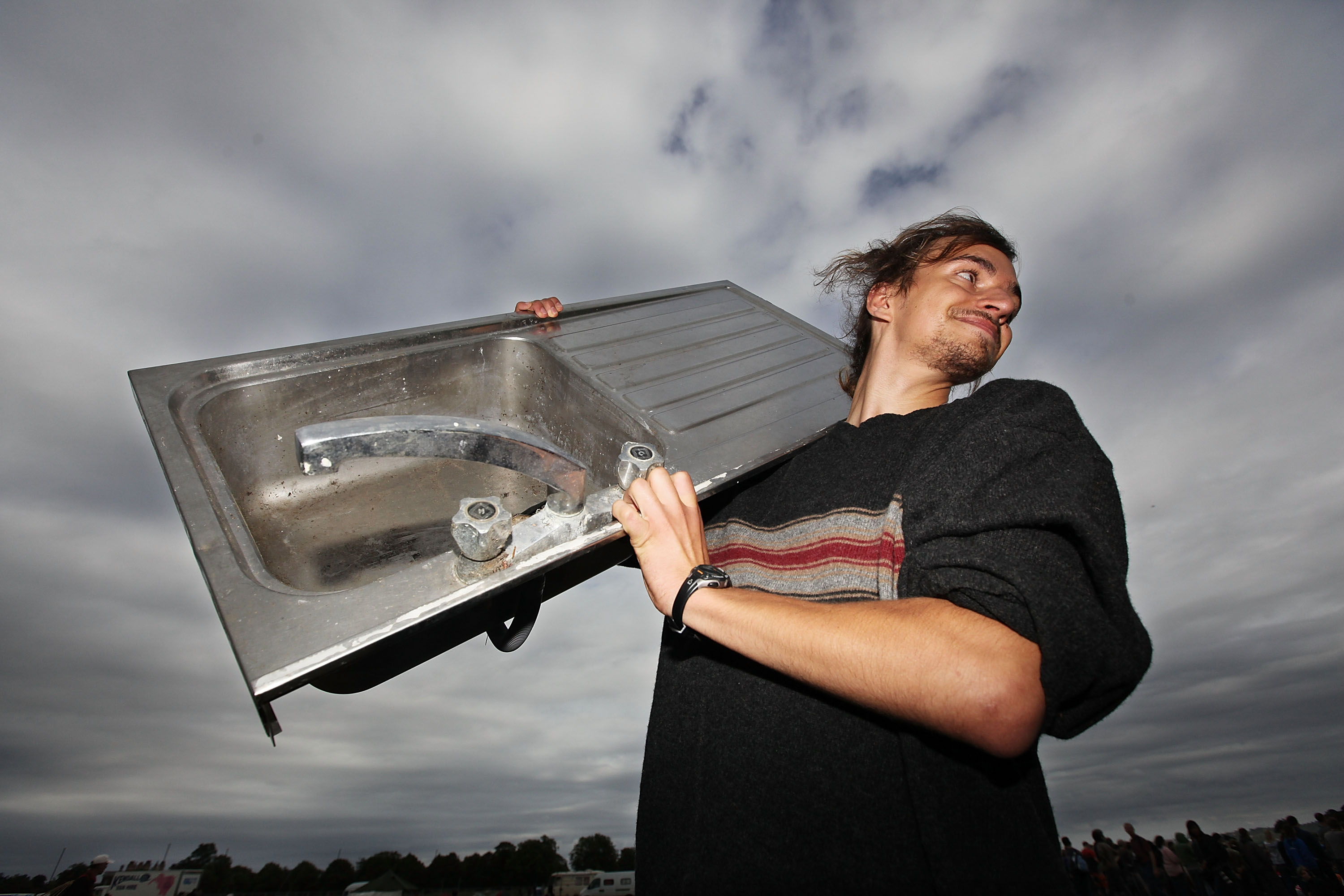 (Photo: A man poses for a picture with a kitchen sink at the Climate Camp on Black Heath on August 26, 2009 in London, England. By Dan Kitwood/Getty Images.)