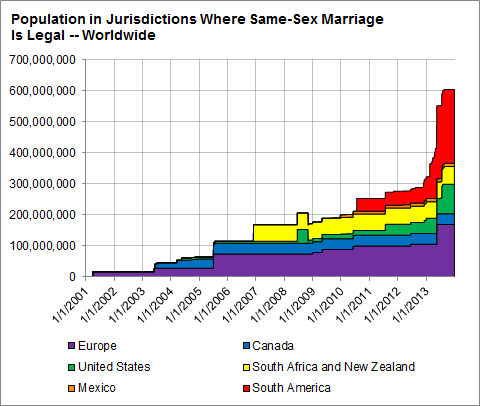 By August, there will be about 585 million people living in countries or jurisdictions where same-sex marriage is legal. That is roughly double the 289 million people living in such places in August 2012.