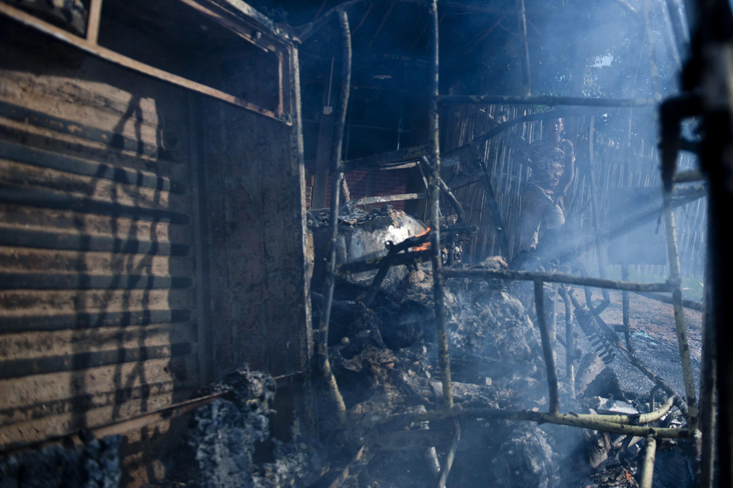 (Photo: A youth watches as a structure burns in Lashio, Shan state of Burma on May 29, 2013. Burma’s government called for calm Wednesday after mobs burned down a Muslim orphanage, a mosque and shops during a new eruption of religious violence in the east of the country. By Ye Aung Thu/AFP/Getty Images.)