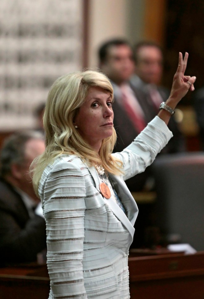 AUSTIN, TX – JUNE 25: State Sen. Wendy Davis (D-Ft. Worth) holds up two fingers against the anti-abortion bill SB5, which was up for a vote on the last day of the legislative special session June 25, 2013 in Austin, Texas. A combination of Sen. Davis’ 13-hour filibuster and protests by reproductive rights advocates helped to ultimately defeat the controversial abortion legislation at midnight. (Photo by Erich Schlegel/Getty Images)