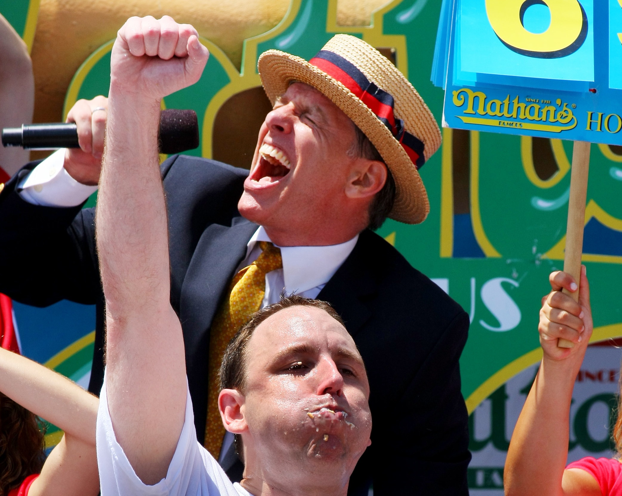 Master of Ceremonies George Shea cheers as Joey ‘Jaws’ Chestnut sets a new record and wins the Nathan’s Famous Fourth of July Hot Dog Eating Contest at Nathan’s Famous in Coney Island on July 4, 2013. Chestnut, of San Jose, California, ate 69 hotdogs in ten minutes to win his seventh straight title. By Monika Graff/Getty Images.