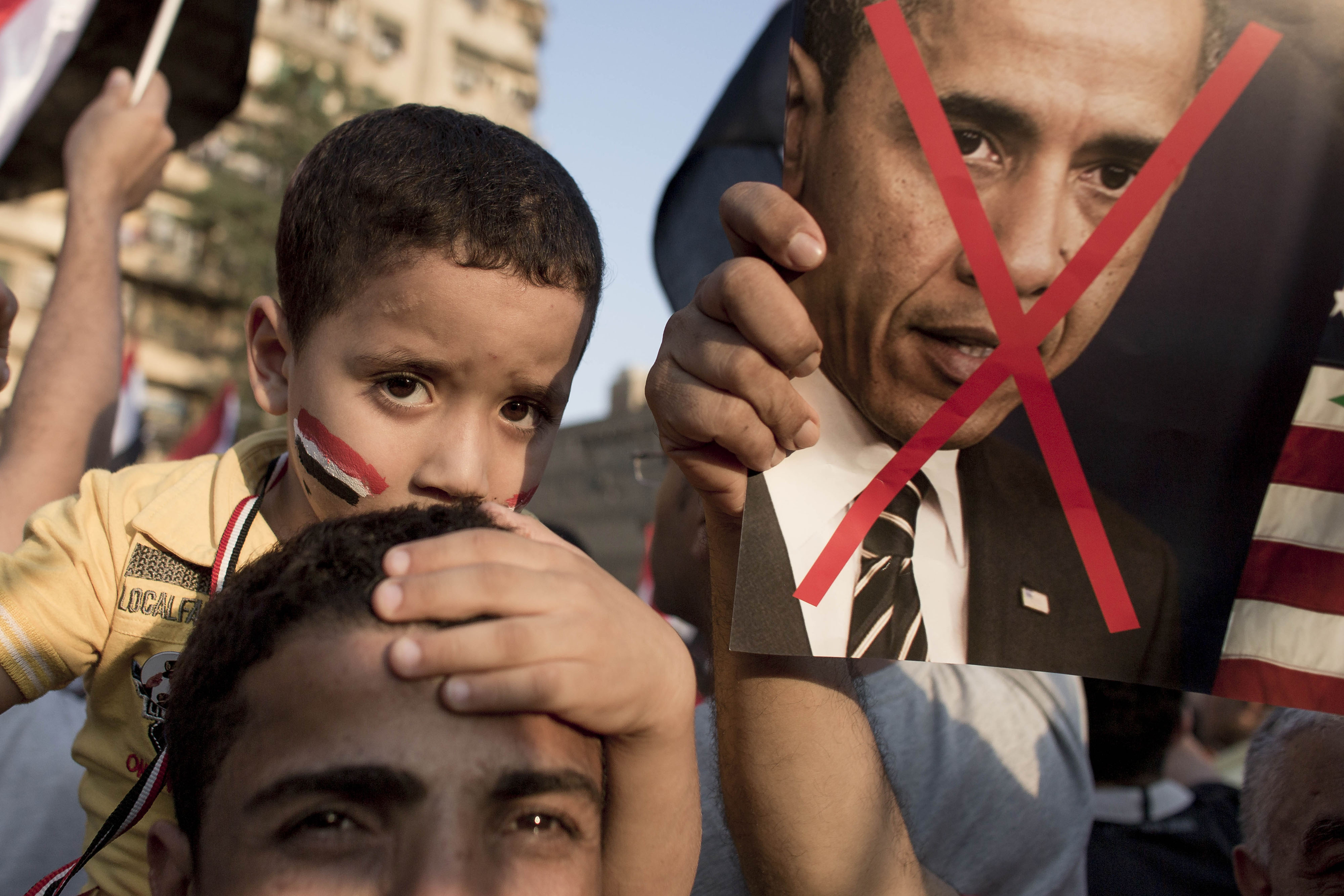 (Photo: A man displays a poster picturing the crossed face of U.S. President Barack Obama as tens of thousands of people attend a rally in Tahrir Square against ousted Egyptian President Mohamed Morsi on July 7, 2013 in Cairo, Egypt. By Carsten Koall/Getty.)