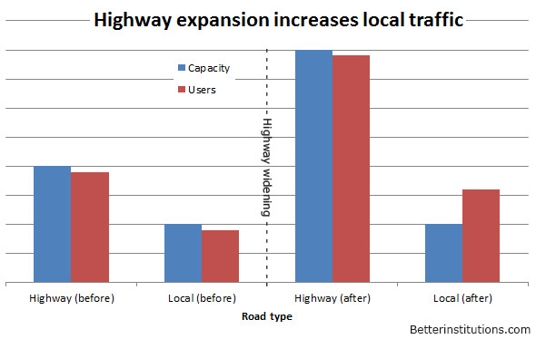 [I]magine this scenario: you live 20 miles outside the city and want to get downtown, so you take the freeway there. The highway part of your trip used to take 30 minutes, but thanks to the new lanes it now only takes you 20 minutes. The last mile of your trip has slowed since there’s a bit more local traffic, but it only increases from three minutes to five. All told, your trip time has decreased from 33 minutes to 25–great!