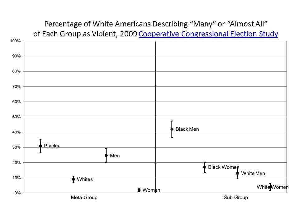 Ismail White and I have been conducting a number of studies on the uniqueness of attitudes toward black men. In a nationally representative sample of white Americans, we find that black men are indeed considered uniquely violent. While a traditional question about racial and gender stereotyping finds that whites perceive “blacks” as more violent than “whites” and “men” as more violent than “women,” a question that asks about combinations of these identities—black men, white women, etc.—shows how black men are uniquely stigmatized. More than 40 percent said that many or almost all black men were violent, but less than 20 percent said that of black women and white men. The figure [above] displays these results (with the bands indicating 95 percent confidence intervals).