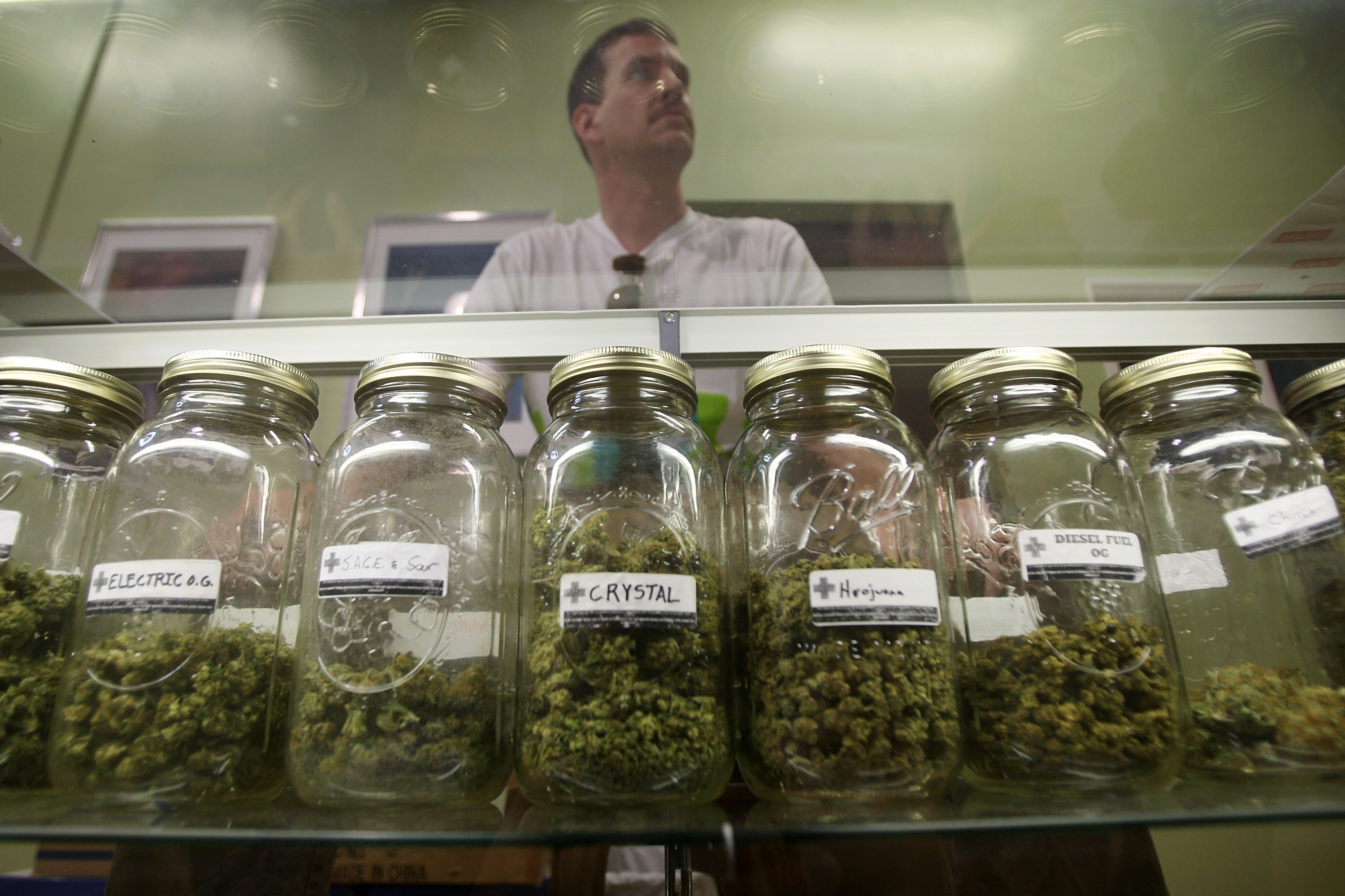 (Photo: Dave Warden, a bud tender at Private Organic Therapy (P.O.T.), a non-profit co-operative medical marijuana dispensary, displays various types of marijuana available to patients on October 19, 2009 in Los Angeles, California. By David McNew/Getty.)