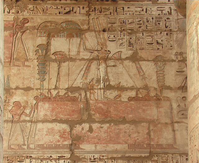 This relief, from the funerary temple of Ramses III at Medinet Habu, for example, depicts Min’s harvest festival. At the center is a statue of Min. Behind him, a procession of priests holds a small garden of lettuce. Min is also sometimes depicted wearing a long, red ribbon around his forehead that some say represents sexual energy.