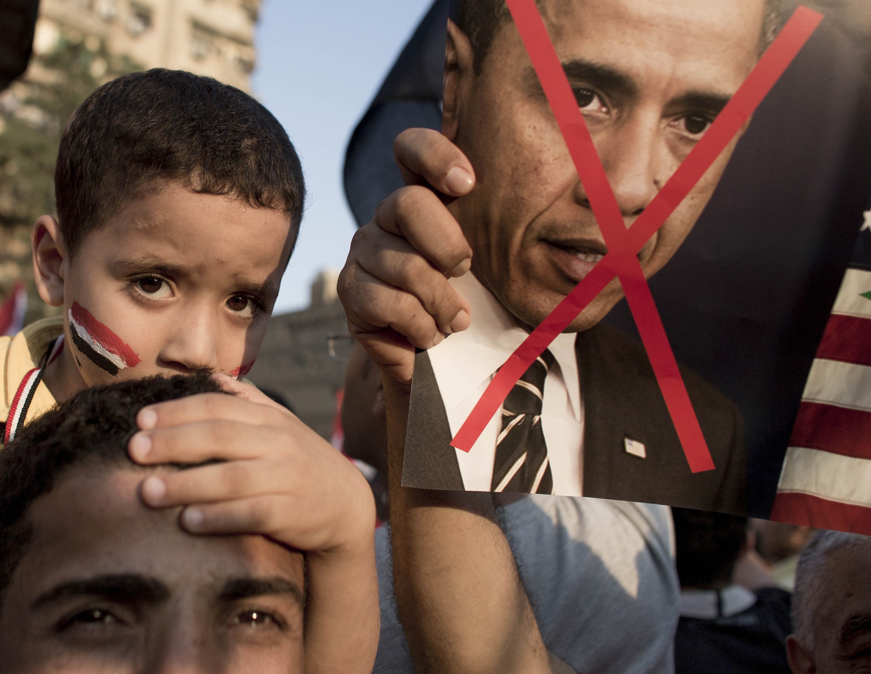 (Photo: A man displays a poster picturing the crossed face of U.S. President Barack Obama as tens of thousands of people attend a rally in Tahrir Square against ousted Egyptian President Mohamed Morsi on July 7, 2013 in Cairo, Egypt. By Carsten Koall/Getty.)