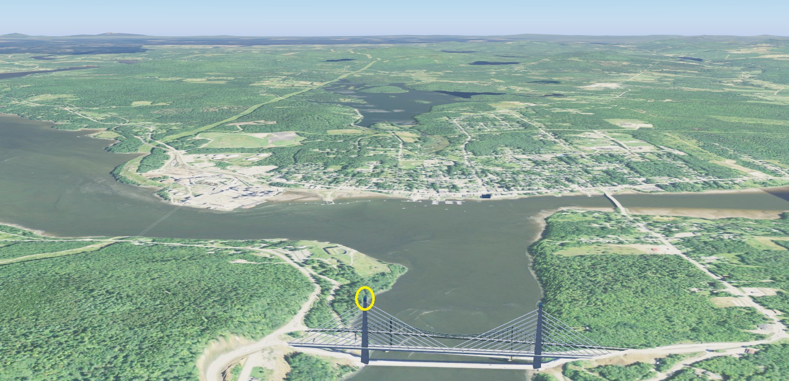 Should be a pretty easy contest. It’s from the highest bridge observatory in the world on the Penobscot Narrows Bridge in Maine. I think it’s from the third window from the left on the north side of the observatory, top floor. (The elevator only goes to the floor below so you get a 360˚ view).